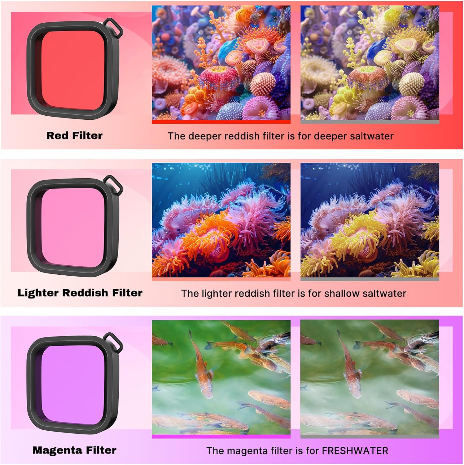 - Rich 16in1 Diving Kit : This diving kit includes a waterproof casing, 3 sets of diving filters, floating handle and 12PCS anti fog inserts, lens and screen protector film, camera silicone protector, and more. Provide comprehensive protection and functionality for your action camera. Help you capture the best shots while swimming, surfing, diving, snorkeling, drifting, water skateboarding, or underwater photography