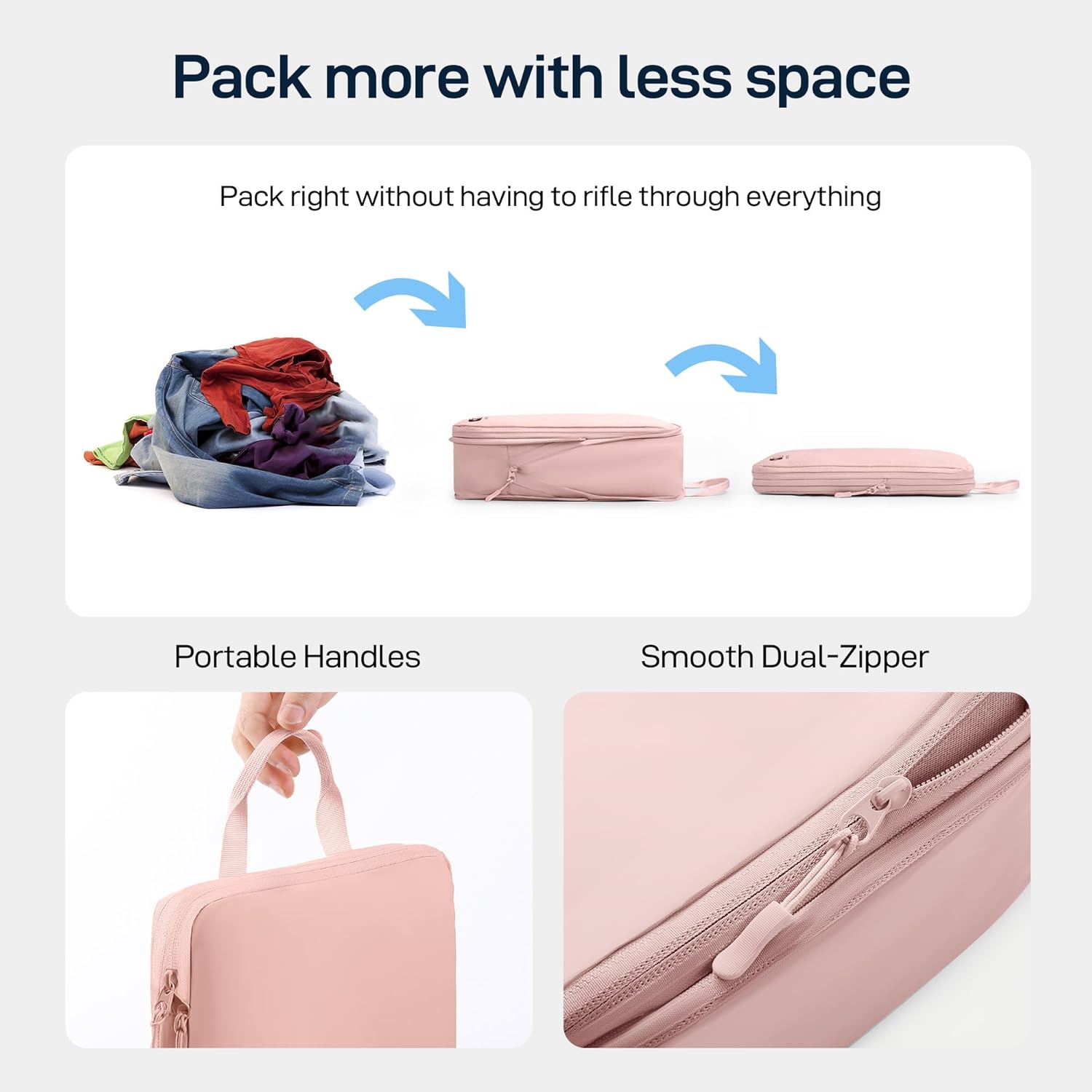 - Two Zipper System with Compressible Design: Featuring a two-zipper system for smooth and secure closure, and they are also compressible. This allows you to compress your items, saving valuable space and maximizing the packing capacity of your luggage.