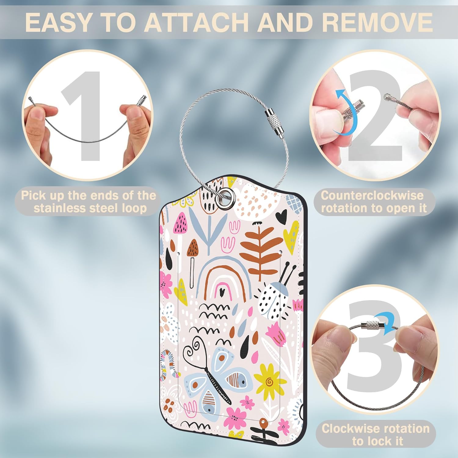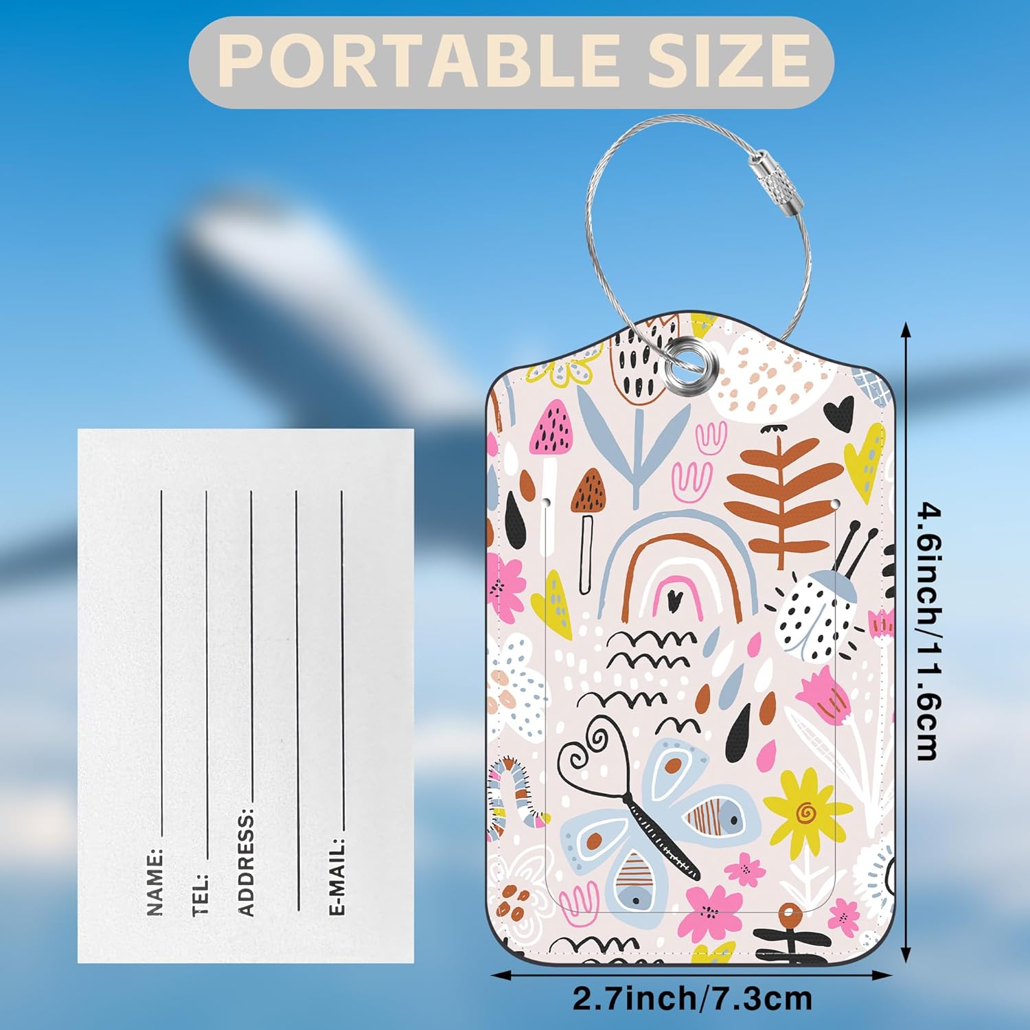2 Pack Luggage Tags for Suitcases Rainbow Butterfly Mushroom Flower Leather Luggage Tags Privacy Cover ID Label with Stainless Steel Loop and Address Card for Women Men Travel Bag Backpack