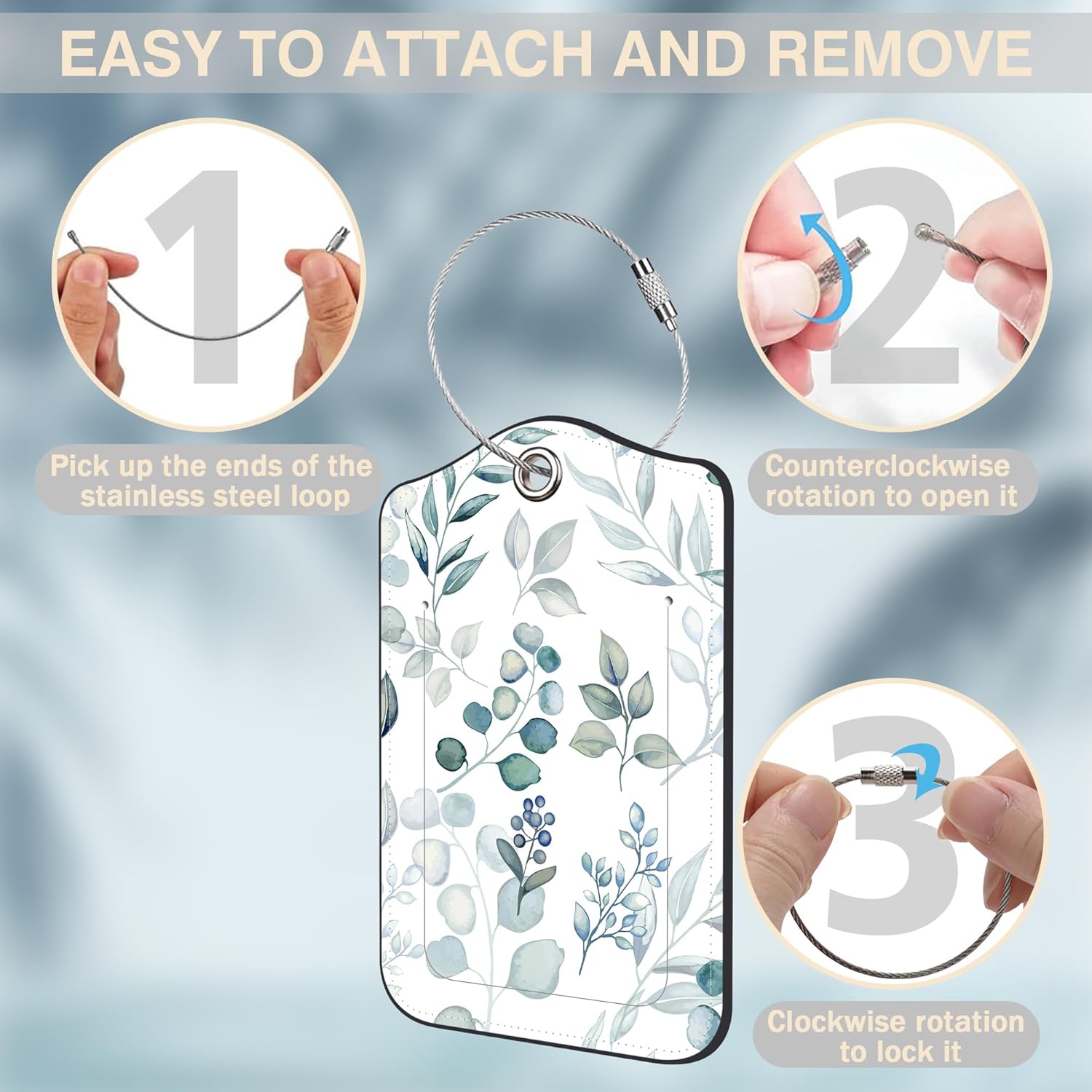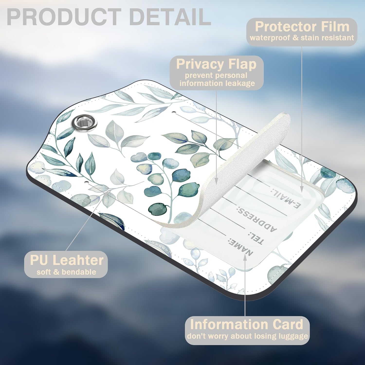 2 Pcs Green Eucalyptus Leaves Luggage Tags for Suitcases PU Leather Baggage Tags Name ID Label with Privacy Cover and Stainless Steel Loop for Men Women Travel Bag Suitcase