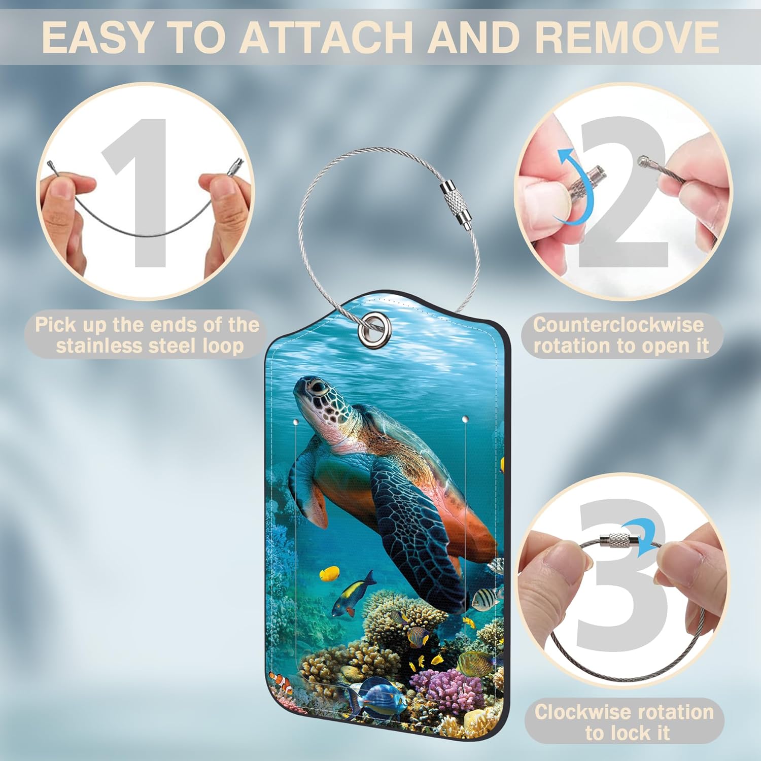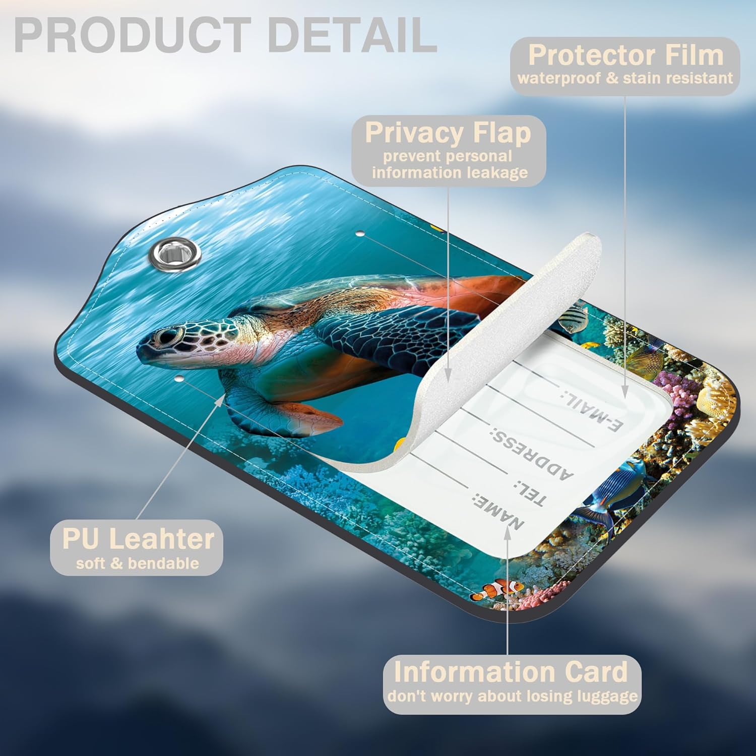 2 Pcs Sea Turtle Luggage Tags for Suitcases PU Leather Baggage Tags Name ID Label with Privacy Cover and Stainless Steel Loop for Men Women Travel Bag Suitcase