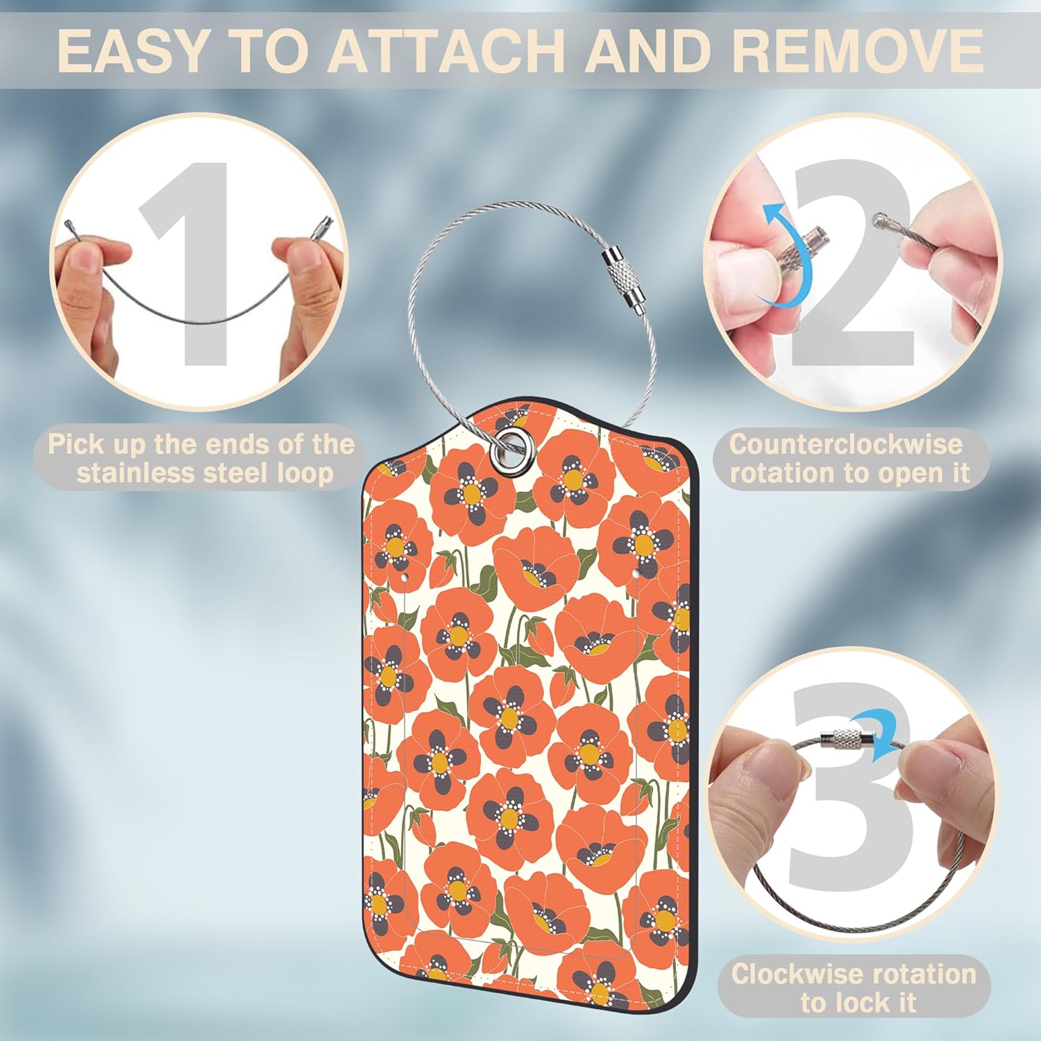 2 Pack Luggage Tags for Suitcases Orange Flowers Leather Luggage Tags Privacy Cover ID Label with Stainless Steel Loop and Address Card for Women Men Travel Bag Backpack