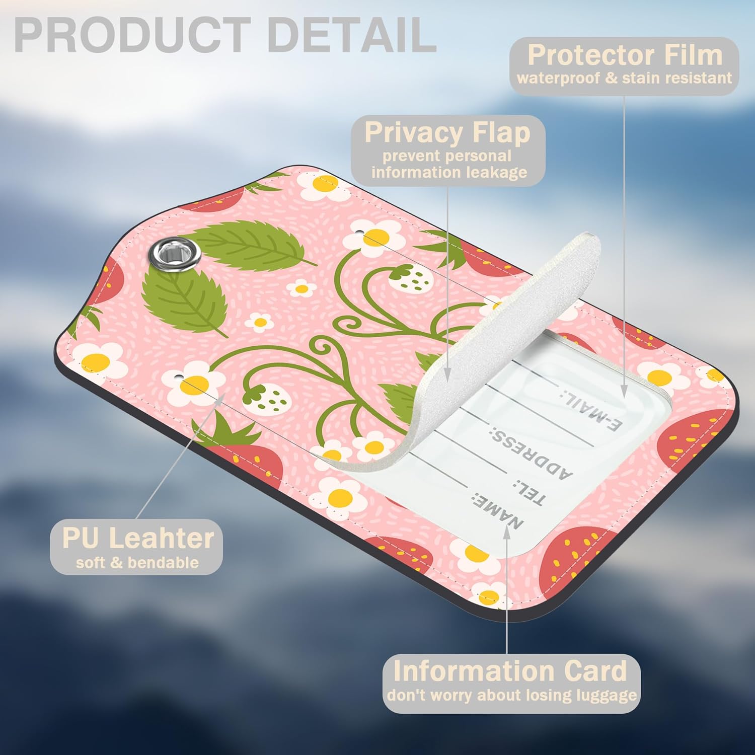 2 Pack Luggage Tags for Suitcases Strawberry and Flowers Leather Luggage Tags Privacy Cover ID Label with Stainless Steel Loop and Address Card for Women Men Travel Bag Backpack