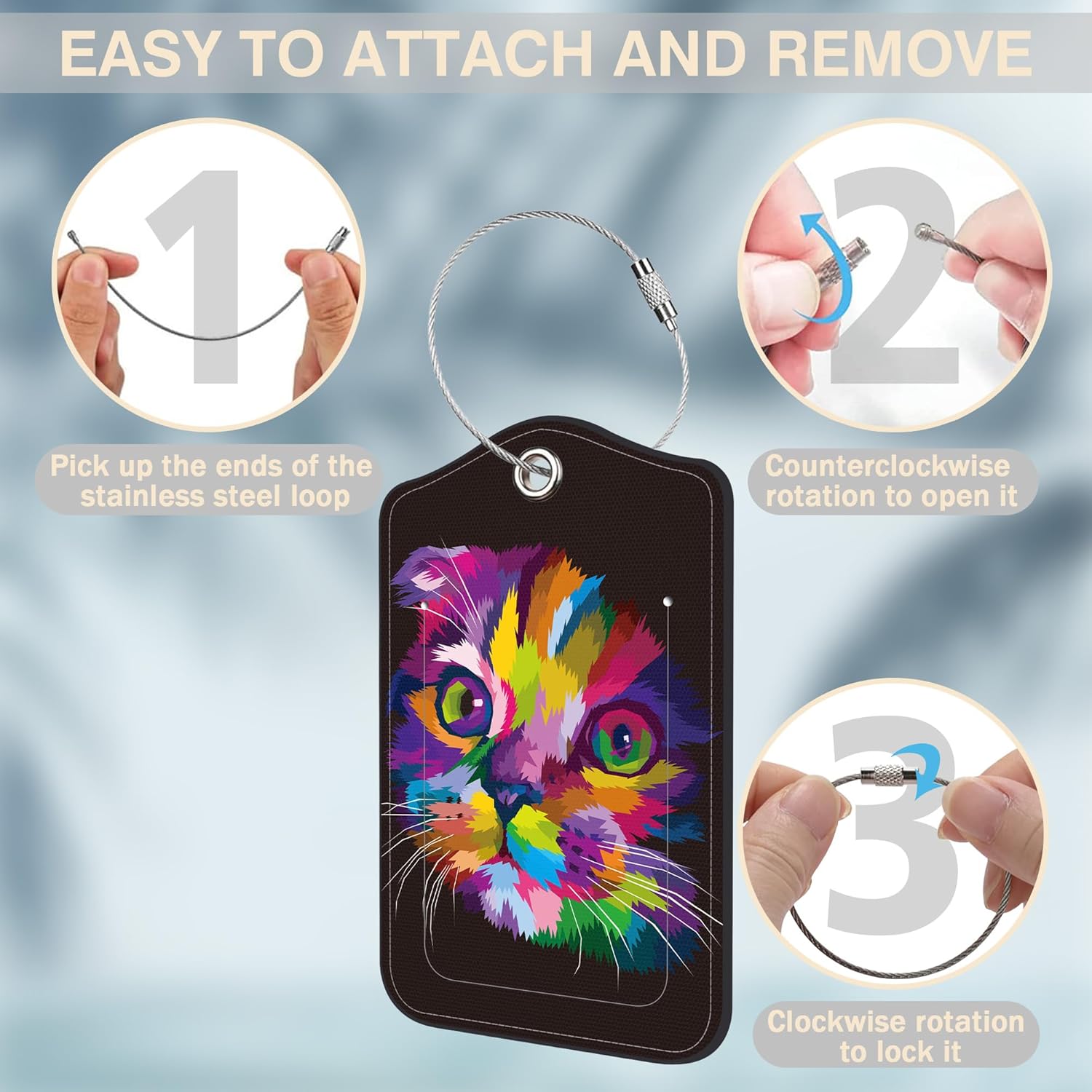 2 Pcs Cute Cat Luggage Tags for Suitcases PU Leather Colorful Art Kitten Animal Baggage Tags Name ID Label with Privacy Cover and Stainless Steel Loop for Men Women Travel Bag Suitcase