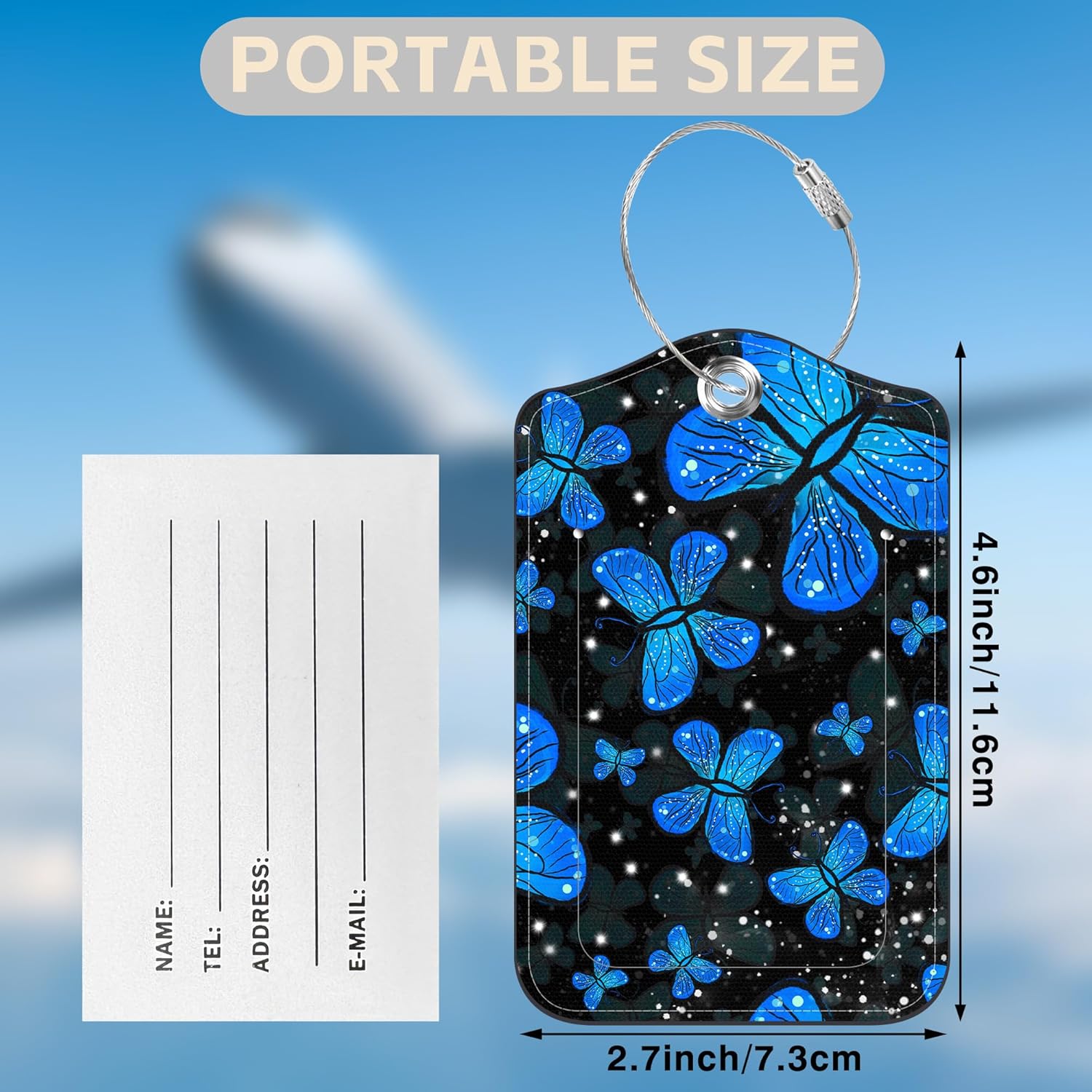 2 Pack Luggage Tags for Suitcases Blue Butterfly Leather Luggage Tags Privacy Cover ID Label with Stainless Steel Loop and Address Card for Women Men Travel Bag Backpack