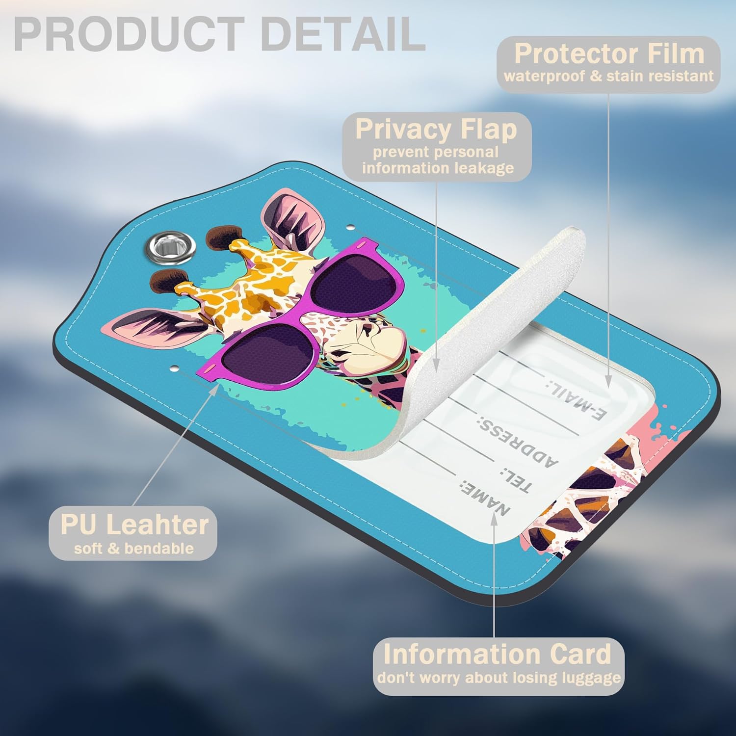 2 Pcs Giraffe in Sunglasses Luggage Tags for Suitcases PU Leather Baggage Tags Name ID Label with Privacy Cover and Stainless Steel Loop for Men Women Travel Bag Suitcase