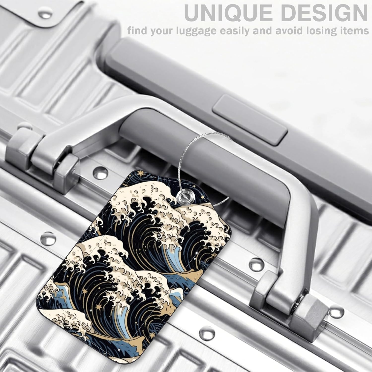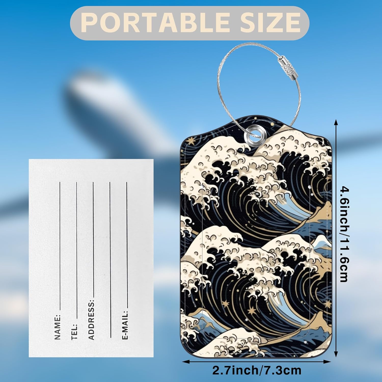 Japanese Art Blue and White Waves Set of 2 Luggage Tags for Suitcases Leather Suitcase Tags Identifiers with Privacy Name Label and Stainless Steel Loop for Women Men Travel Luggage Accessories