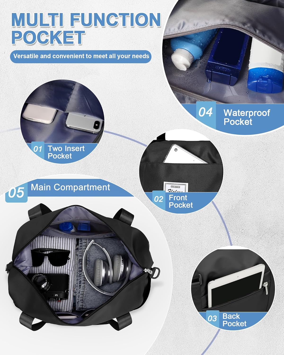 - 【High Capacity Travel Bag】Travel Bag has three multiple internal and four external organizational pockets,which ensure you placed more scientifically and orderly.The overnight bag for women has Large Capacity.Ordinary size :41*26*22CM,Expansion Dimension:41*37*22CM.You can carry it onto an airplane. Large storage space for a clothes for short trip.It has a capacity of 35L and can hold 6 to 8 pieces of summer clothes,Cosmetics,toiletries,wallets,keys,earphones,mobile power,mobile phones,files.