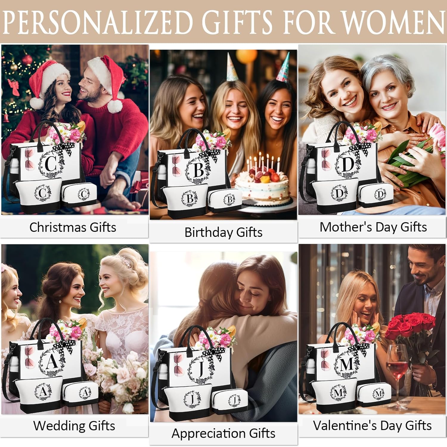 - PERSONALIZED GIFTS FOR WOMEN: The women tote bag set can also be used as gifts for her, mom, sister, friend, daughter, girlfriend, coworker, teacher on birthday, Christmas, Mother's Day, Valentine's Day, Boss's Day, Teacher's Day, Nurse Week, retirement, graduation, wedding, Thanksgiving, which will surely surprise them! This Personalized Gifts for Women is also an excellent way to thank bridesmaids, hostess, brides-to-be, friends, relatives &guests for their love and support on your special day