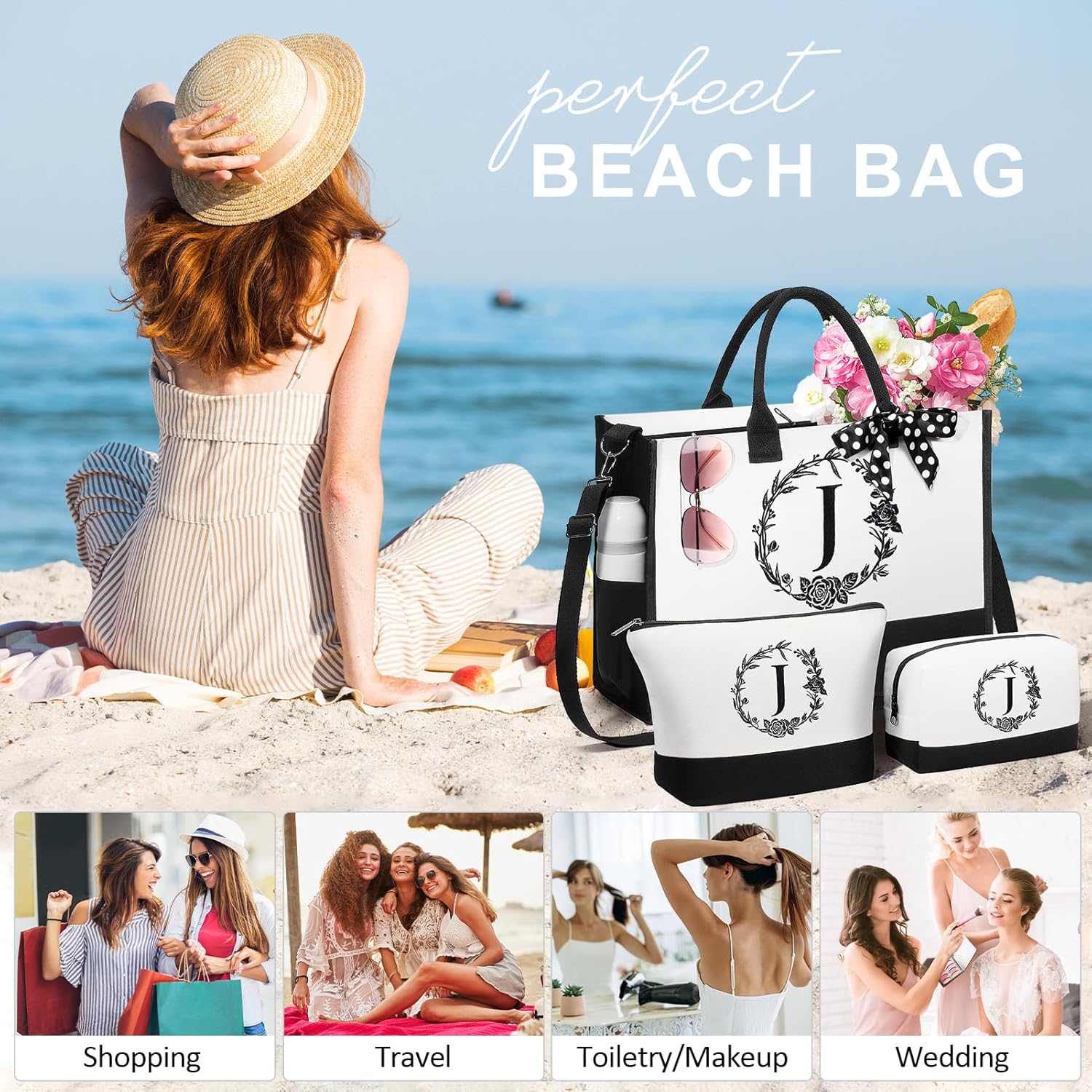 - IDEAL DAILY COMPANION: This initial tote bag & makeup bags set for women feature a spacious design, making them perfect for organizing essentials for beach, travel, camping, swimming, gym and yoga. The Bridesmaid Gifts Wedding Bridal Shower Gifts Monogrammed Gifts for Women are perfect for carrying essentials like cosmetics, toiletries, jewelry & outfits. It is also a great commuter bag for holding magazine, laptop, lunch, and it serves well as a handy shopping bag for groceries, snacks & drinks