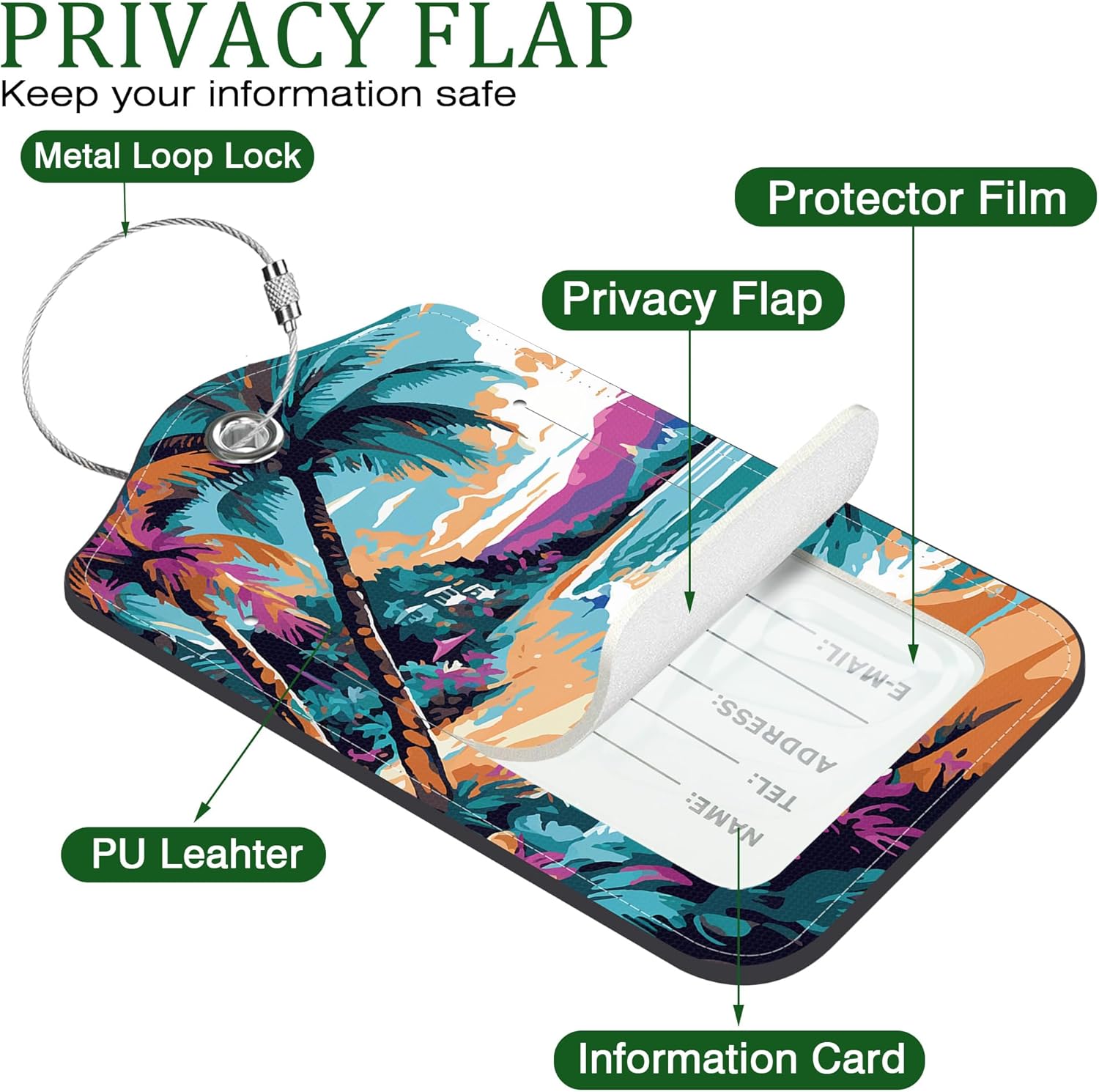 - High-Quality Material: This leather luggage tag is made of high-quality leather and printed in double-sided colors. The matching detachable stainless steel ring can firmly fix your luggage tag, bringing you a pleasant mood during your journey