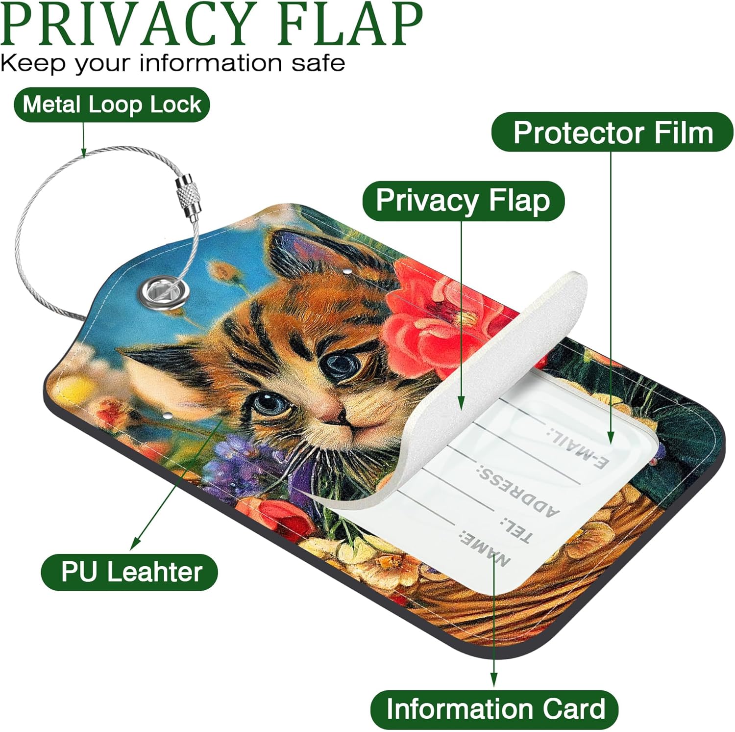 2 PCS Leather Luggage Tags for Suitcase Beautiful Cat Flowers Travel Luggage Tag with Privacy Flap Name ID Label and Metal Loop for Travel Bag Suitcase