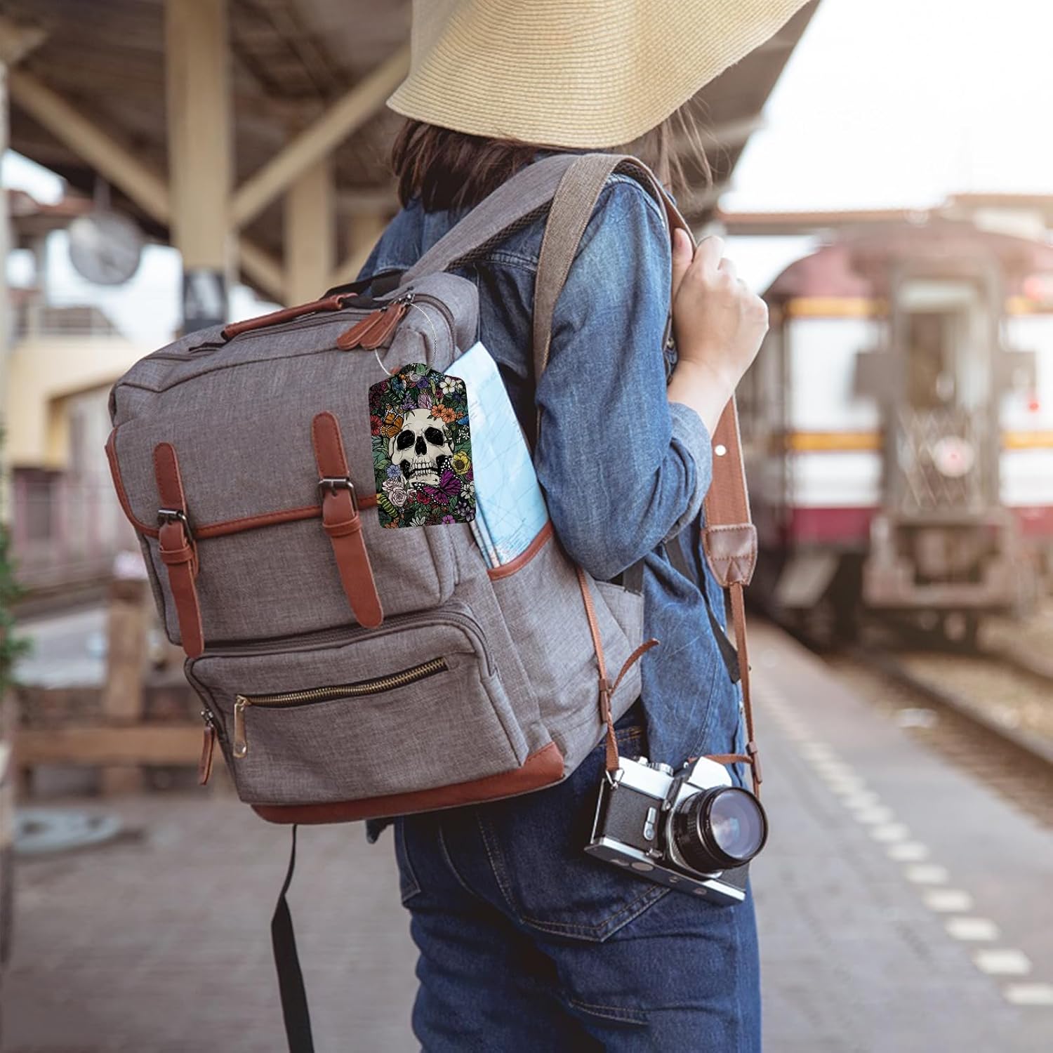 Skull and Colorful Flower Luggage Tags for Suitcases,2 Pack Luggage Tag, Leather Stainless Steel Loop Label Tag for Women Girl Travel Bag Suitcase