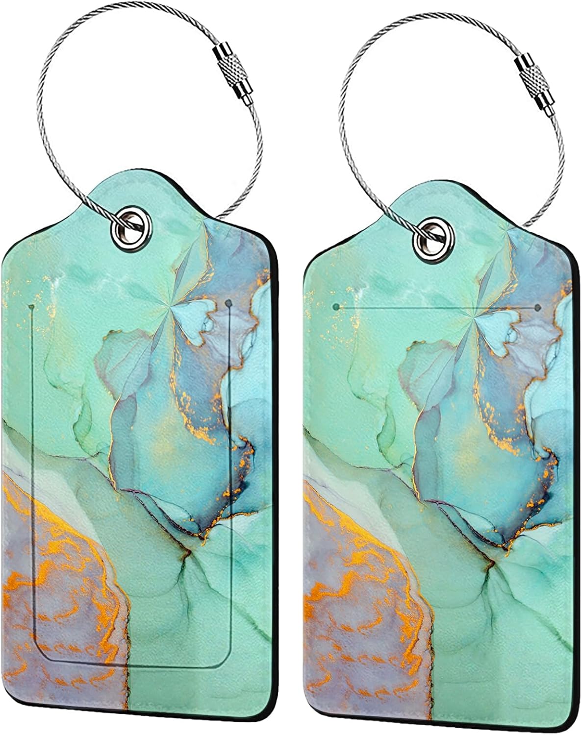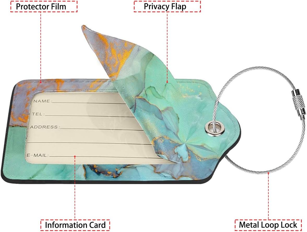 Green Gold Marble 2-Pcs Premium Leather Tags with Privacy Covers,Luggage Tag Stainless Steel Loops Ideal for Suitcases, Travel Bags, Backpacks