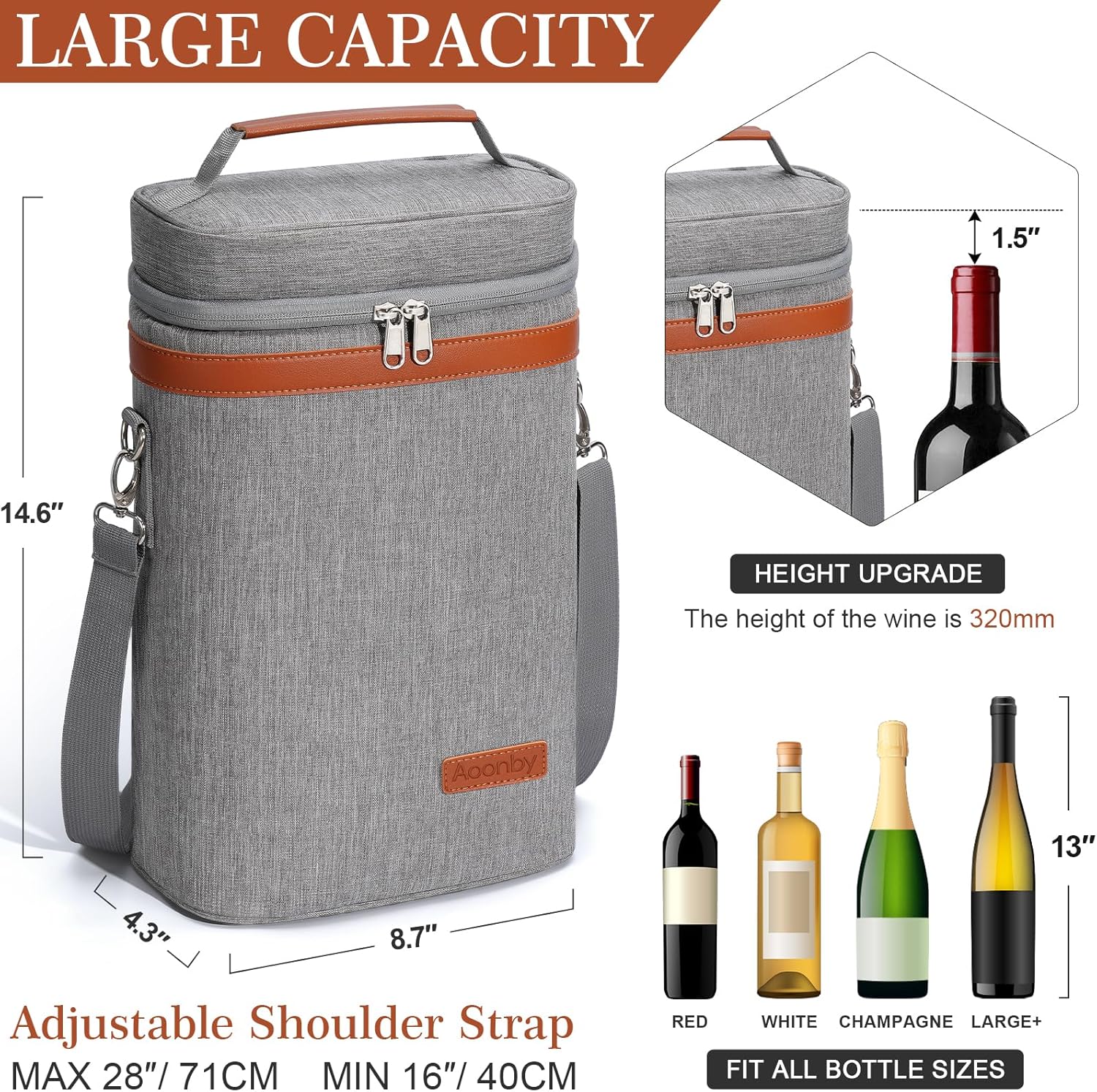 - PERFECT SIZE & NONFUNCTIONAL: Aoonby Insulated Wine Carrier Wine Gift Tote Bag (8.7’L x 4.3’W x 14.6’H) is designed with enough space to hold two normal size bottles of wine, or one bottle with 2 small wine tumblers. Great for dinner, travel, party, picnic, pool, beach, concerts, wine tasting, BYOB, restaurant, sporting events, camping or trip. Suits beverages like liquor, champagne, whiskey, beer, juices, etc. Ideal as Engagement Gifts, Wedding Gifts, Housewarming Gifts, Bridal Shower Gifts
