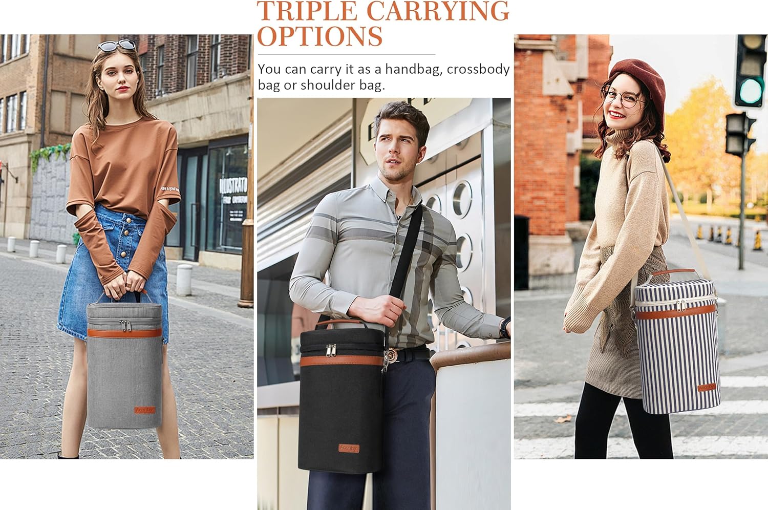 - CONSIDERATE DESIGN & POTABLE CARRYING: Interior removable padded divider keeps 2 bottles separate and avoid colliding. 4 elastic straps on the top designed for wine accessories storage such as wine opener, wine stopper, wine aerator pourer. The detachable & adjustable shoulder strap (16" to 28") with thick soft pad and sturdy PU leather handle let you carry this wine bottle carrier bag insulated wine tote bag effortlessly & comfortably as cross-body bags, shoulder bags, or tote bag