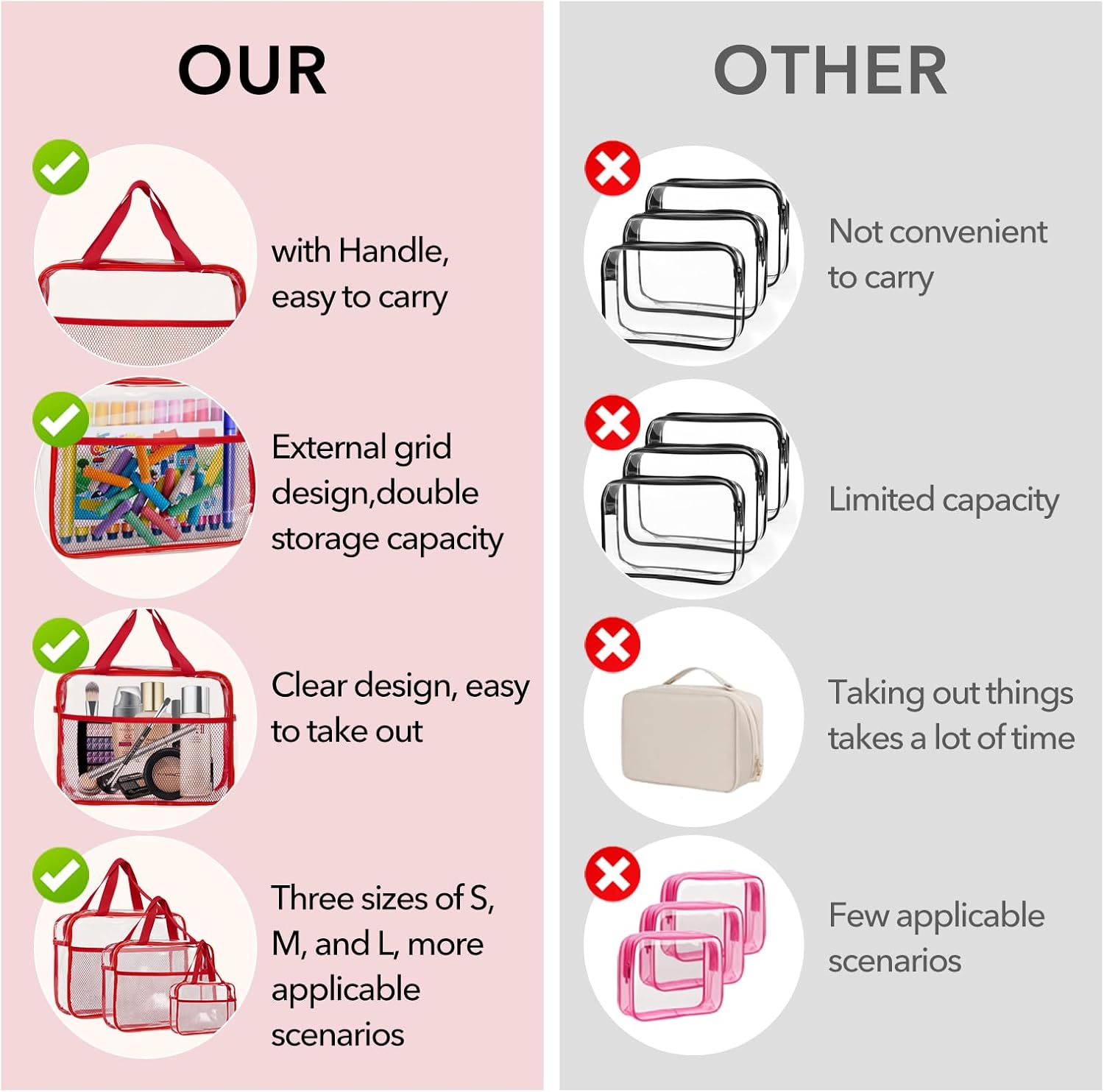 XEWEA Clear Travel Toiletry Bags, 3 Pack TSA Approved Transparent Makeup Bag for Men Women, Large Waterproof PVC Quart Organizer Kit with Zipper for Toiletries Airline Essential,Toy Storage Pouch Red