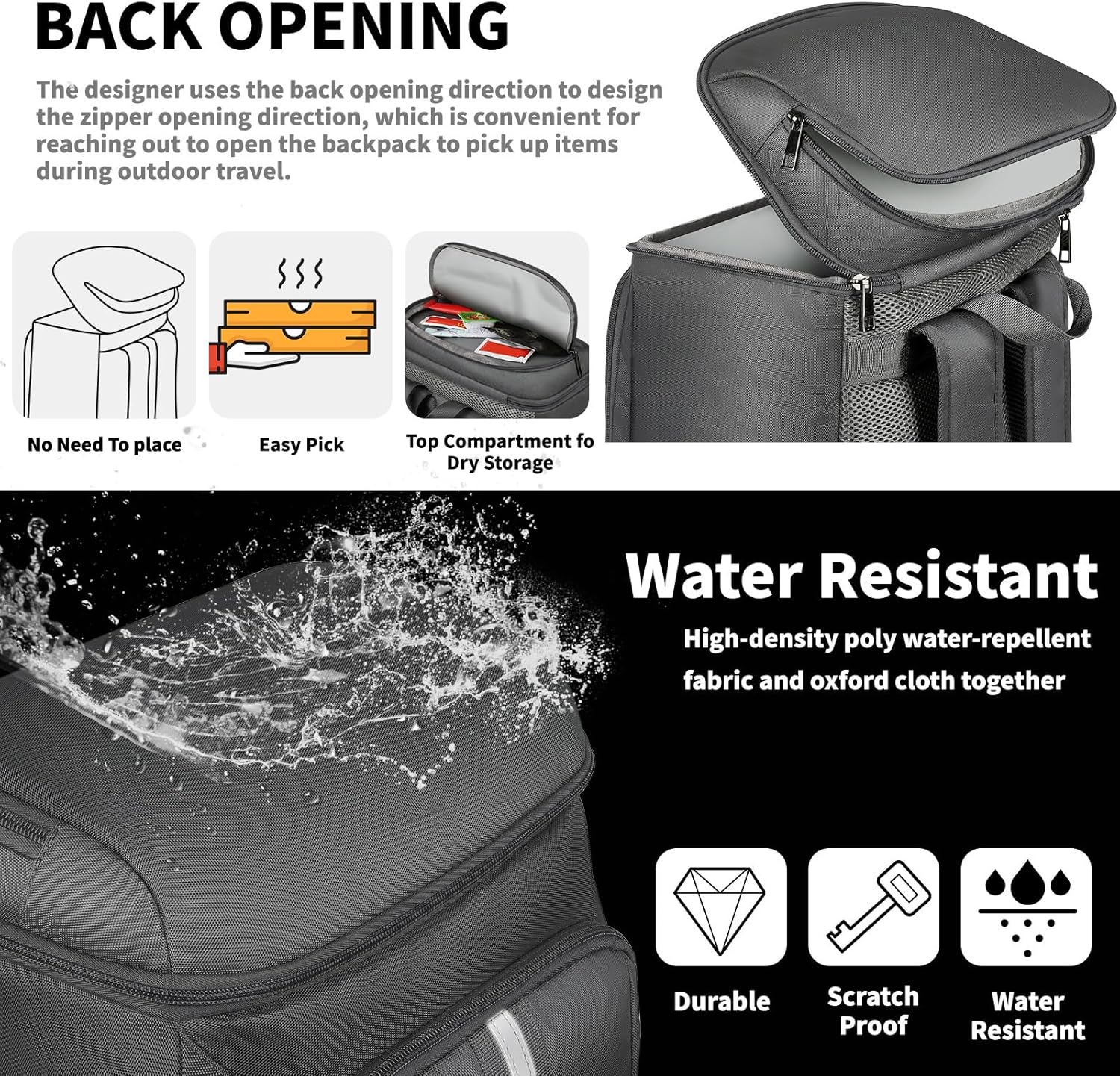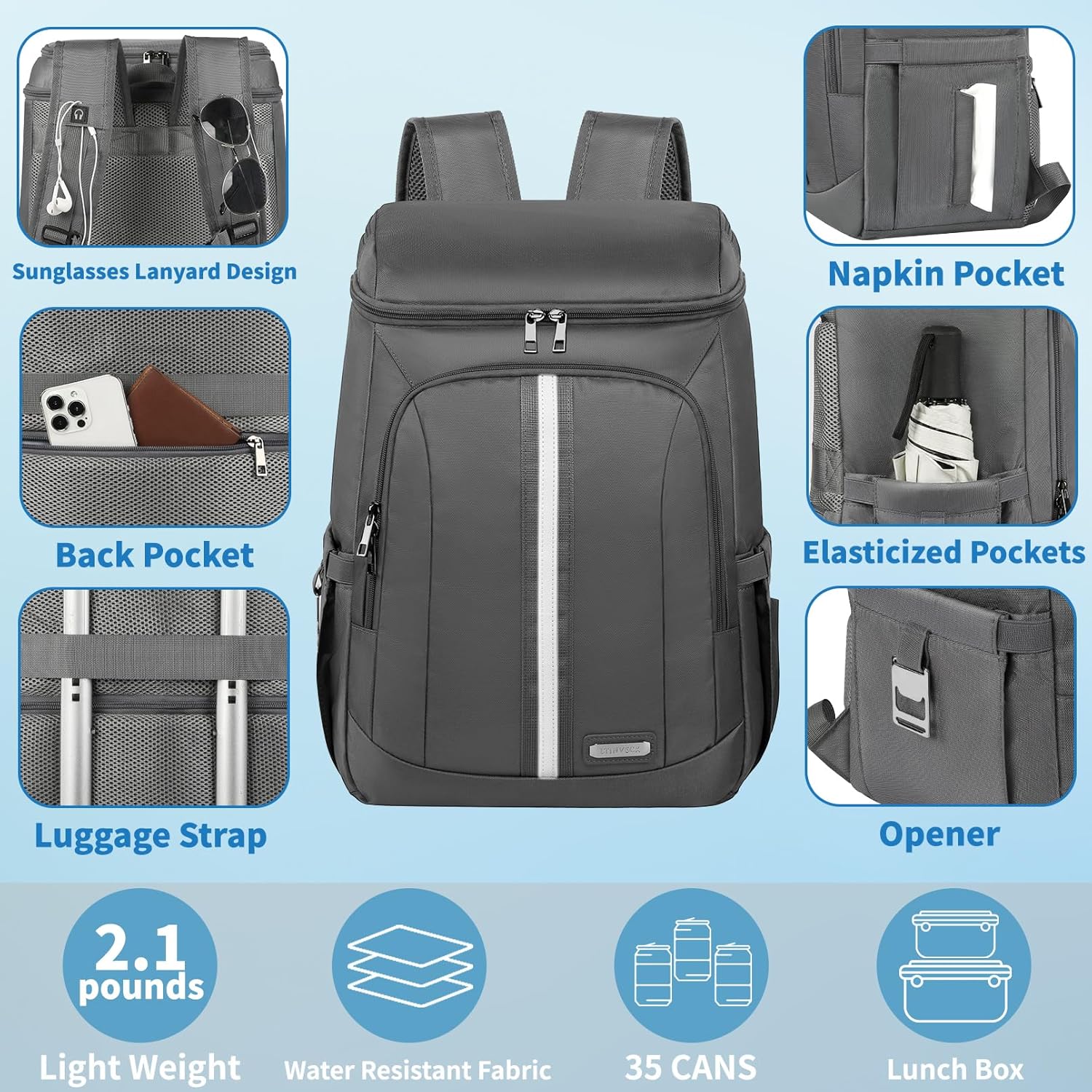 - Multiple Pockets Backpack: The backpack cooler leakproof includes 1 main large insulated leak proof storage compartment for 1 upper half compartment used to organize dry items, 1 large front zipper pocket for tableware. 2 large side pockets which are perfect for 2 umbrella or water bottles and 1 bottle opener on the side pockets for your easily use
