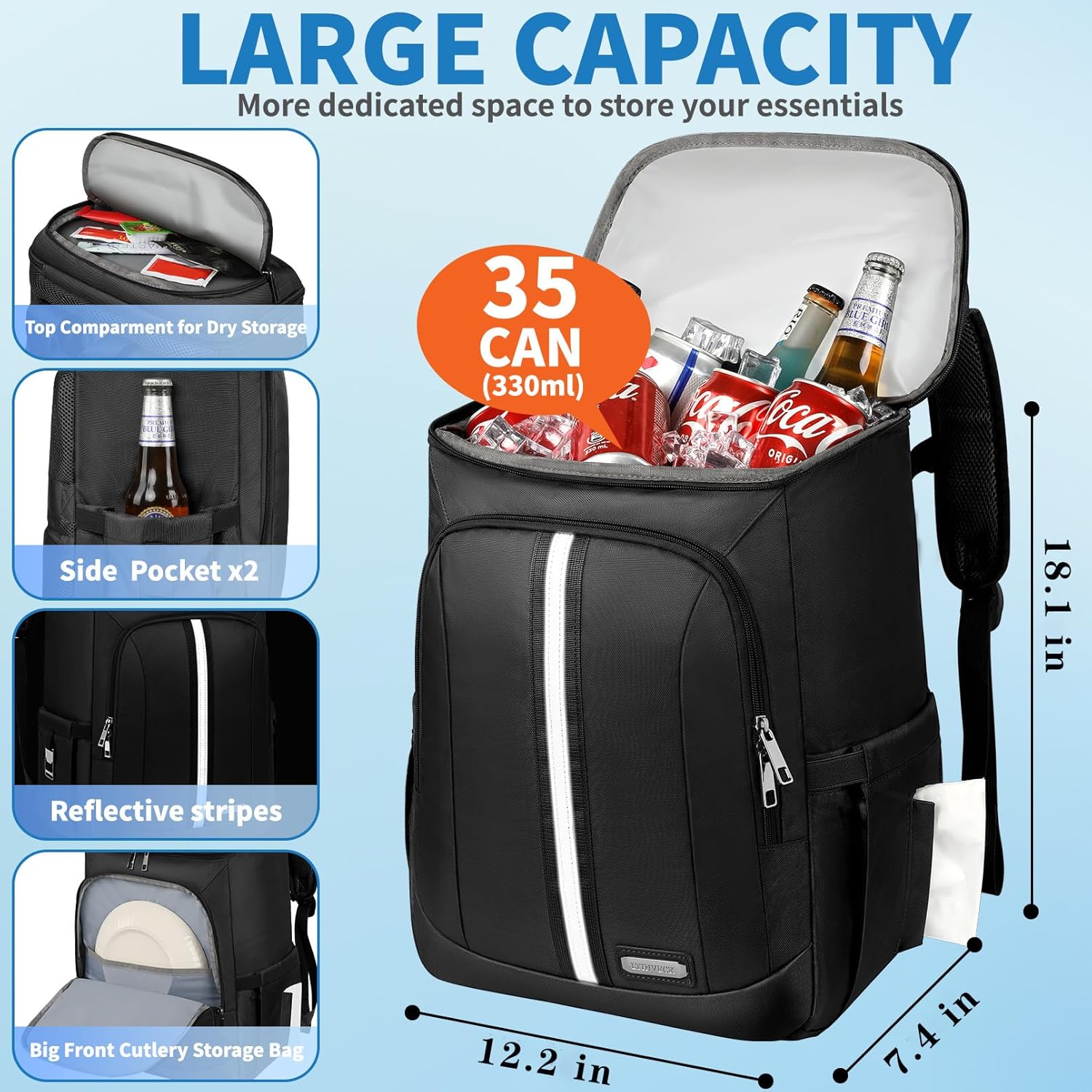 - Large Capacity Lunch Cooler Bag: Measures 18 x 12.6 x 7.9 inch and can hold up to 35 cans (330ml).This lunch backpack cooler is a roomy design,it is big enough to pack,You can use it as an insulated lunch backpack as well as a portable cooler for a beach, picnic, hiking, fishing, camping, travel or other outdoor activities camping, travel or other outdoor activities
