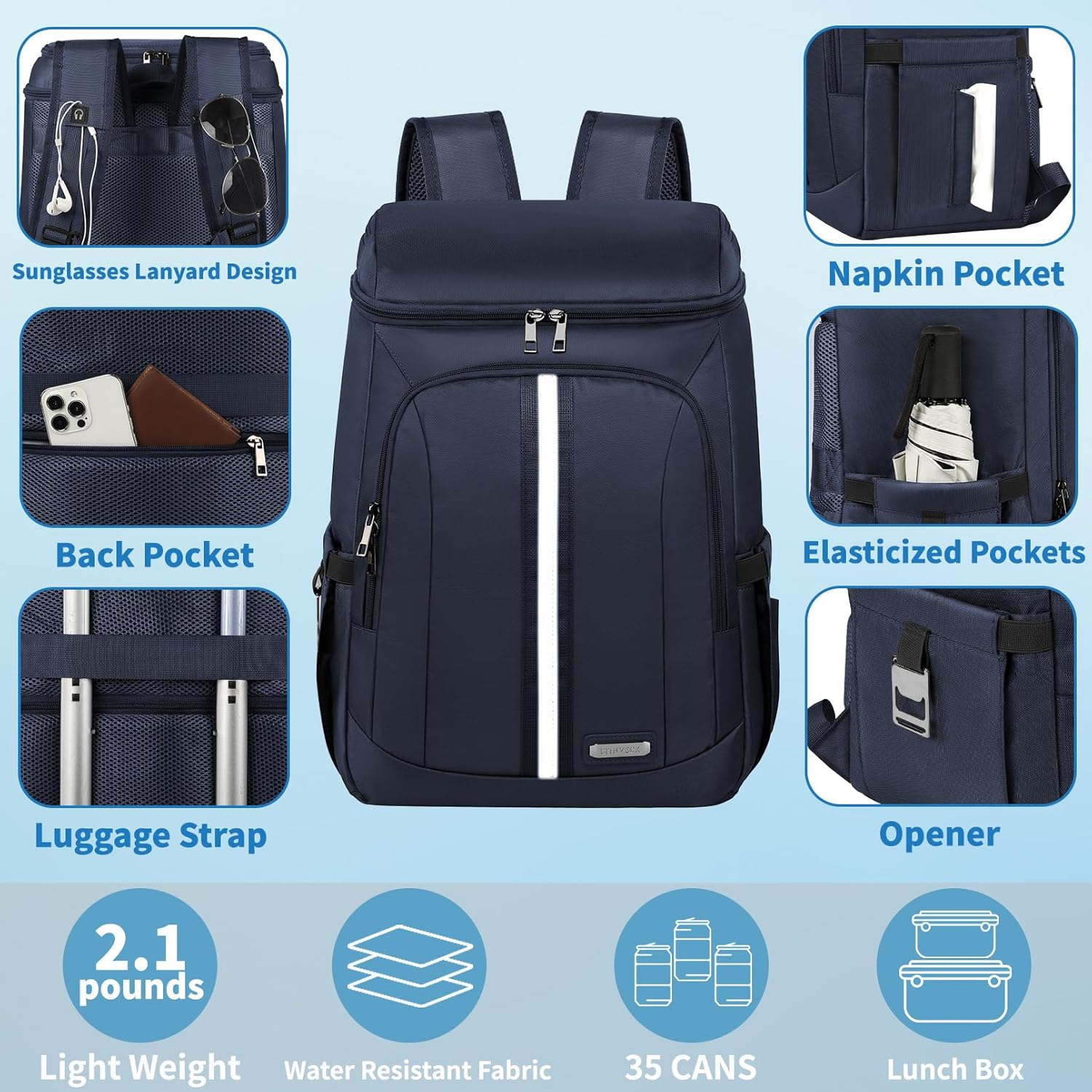 Backpack Cooler Insulated Leak Proof 35 Cans, 2 Insulated Compartments Thermal Bag, Portable Lightweight Beach Travel Camping Lunch Backpack for Men and Women, 30L, Reflective Stripes, Water-Resistant