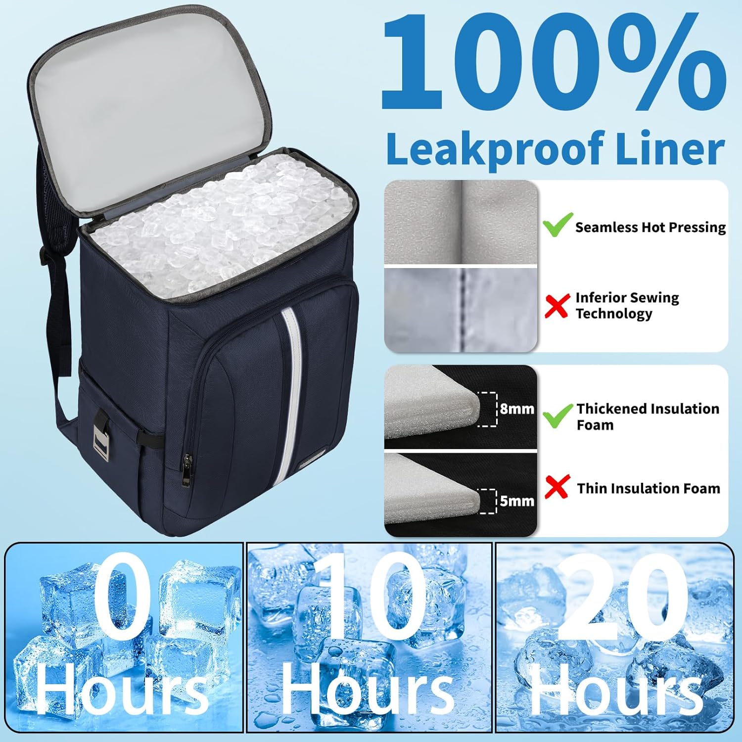 - Insulated Cooler Backpack: High Density insulation thicken material and upgraded leak proof liner of the soft cooler backpack work together to make sure anti-leaking and keep hot cold for 20 hours. We recommend storing hot and cold and separately for better results
