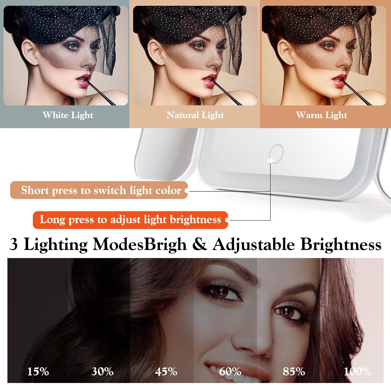 - 【3-COLOR LIGHTED MAKEUP CASE】Mirror 3-color light, stepless adjustment of brightness. Short press to adjust the color temperature, long press to adjust the brightness. Built-in rechargeable battery, which can last for two weeks on a single charge, comes with a Type-C charging cable.