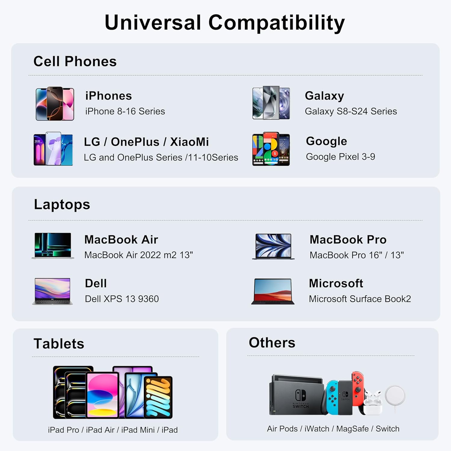 - Compatible Phone Models : MacBook Pro 13''/ MacBook Pro 15''/ MacBook Pro 16"/ MacBook Air 13''/ MacBook 12''; iPhone 16/16 Plus/16 Pro/16 Pro Max, iPhone 15/15 Plus/15 Pro/15 Pro Max, iPhone 14 14plus 14 pro max 13/ 13 Mini/ 13 Pro/ 13 Pro Max, iPhone 12/ 12 Mini/ 12 Pro/ 12 Pro Max/ XS/ XS Max/ XR/ X/ 11/ 11 Pro/ 11 Pro Max/ iPhone SE 2020/ 8 Plus/ 8; Samsung Galaxy S23+/ S23/ S23 Ultra/ S22+/ S22/ S22 Ultra/ S21+/ S21/ S21 Ultra/ S21 FE/ S20+/ S20/ S10/ S10e/ S10+/ S9/ S9+/ S8/ S8+/ Note 20/ Note 9/ Note 8/ Z Flip/ Z Fold; Dell XPS 15/ 13; Google Pixel 5/ Pixel 4a/ 4 XL/ 4/ Pixel 3a/ 3a XL/ 3 XL/ 2 XL /2; iPad Pro 12.9''/ iPad Pro 10.5''/ iPad Pro 11''/ iPad Mini Series/ iPad Air Series; AirPods Pro, Nintendo Switch; LG G7/ V30+; Nexus 5X/ 6P, Sony XZ2 Premium, Sony XZ3, and more., Cellular Phones, Smartwatches MacBook Pro 13''/ MacBook Pro 15''/ MacBook Pro 16"/ MacBook Air 13''/ MacBook 12''; iPhone 16/16 Plus/16 Pro/16 Pro Max, iPhone 15/15 Plus/15 Pr… See more