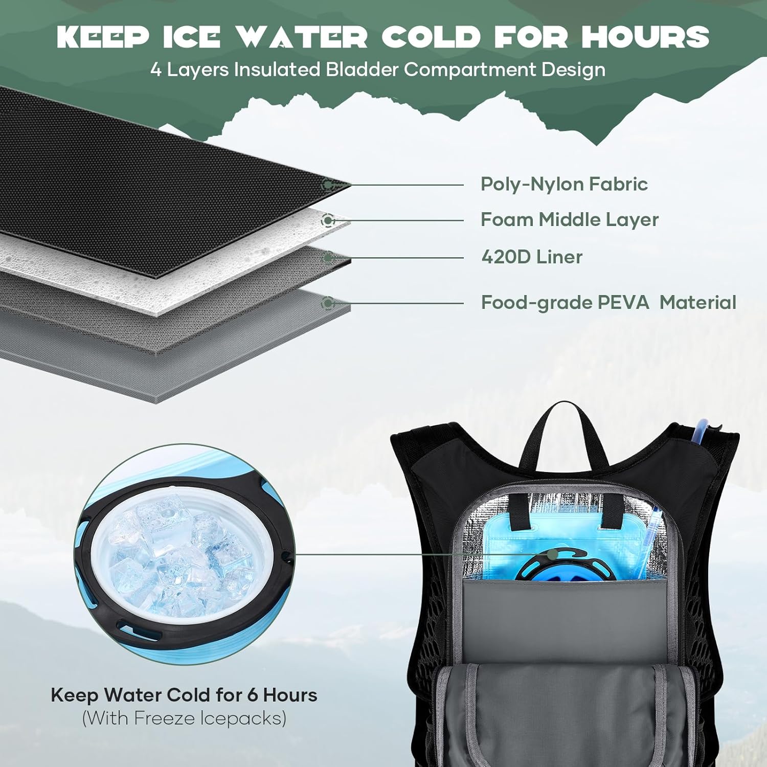 - Hands-Free Leakproof Water Bladder:Stay hydrated on the go with a 2-liter bladder and bilateral hose outlets. The large opening design of the bladder ensures easy filling and cleaning. The separate insulated compartment provides hours of cooling with ice packs. The bladder is replaceable and supports up to 3 liters.