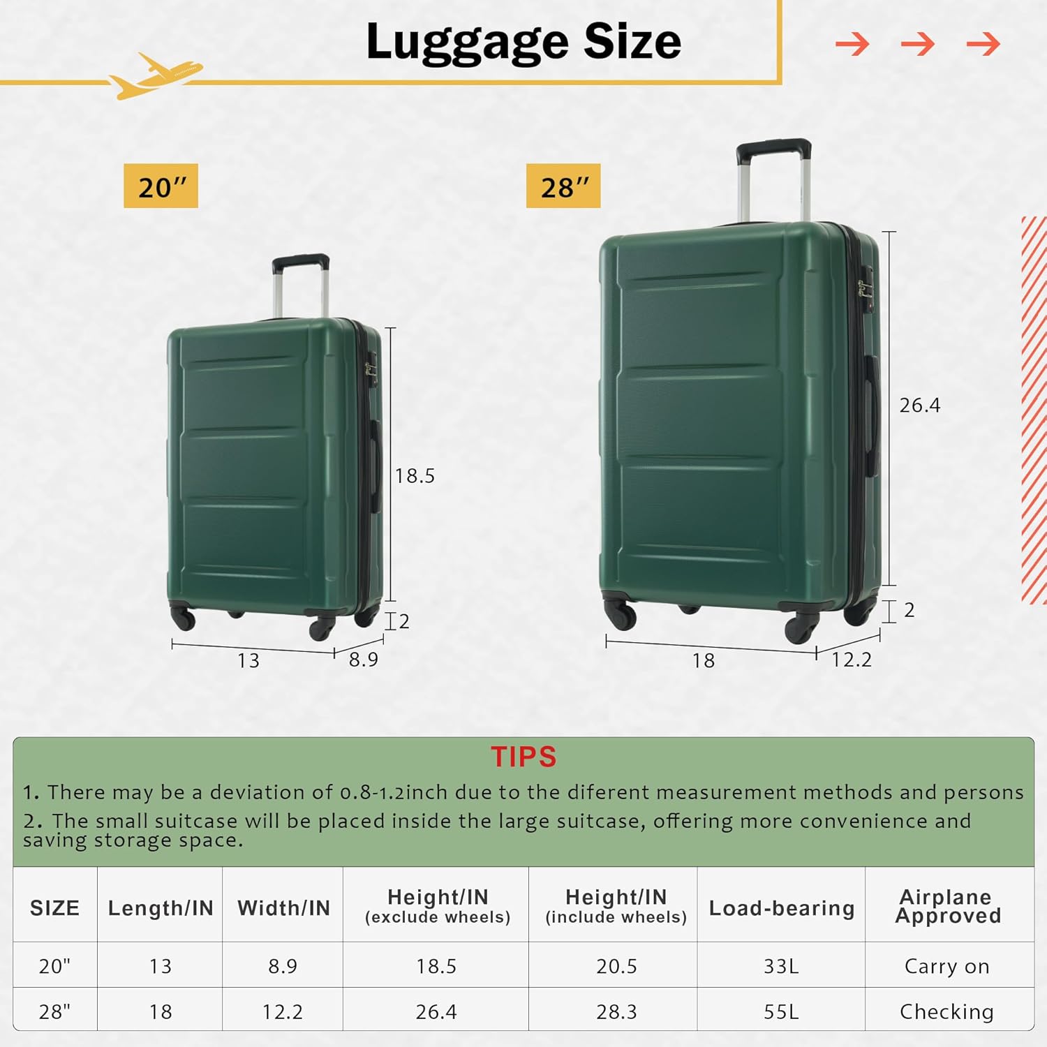 - Size:20 IN suitcase dimensions(included accessories): 13"x8.9"x20.5";28 IN luggage dimensions(included accessories):18"x12.2"x28.3"; Expandable travel bag dimensions :longest length: 23", shortest length: 15.7", width: 8.3", height(without extension): 12.2", expansion part height: 3.9";Toiletry bag dimensions: 10 "x5.5"x4".