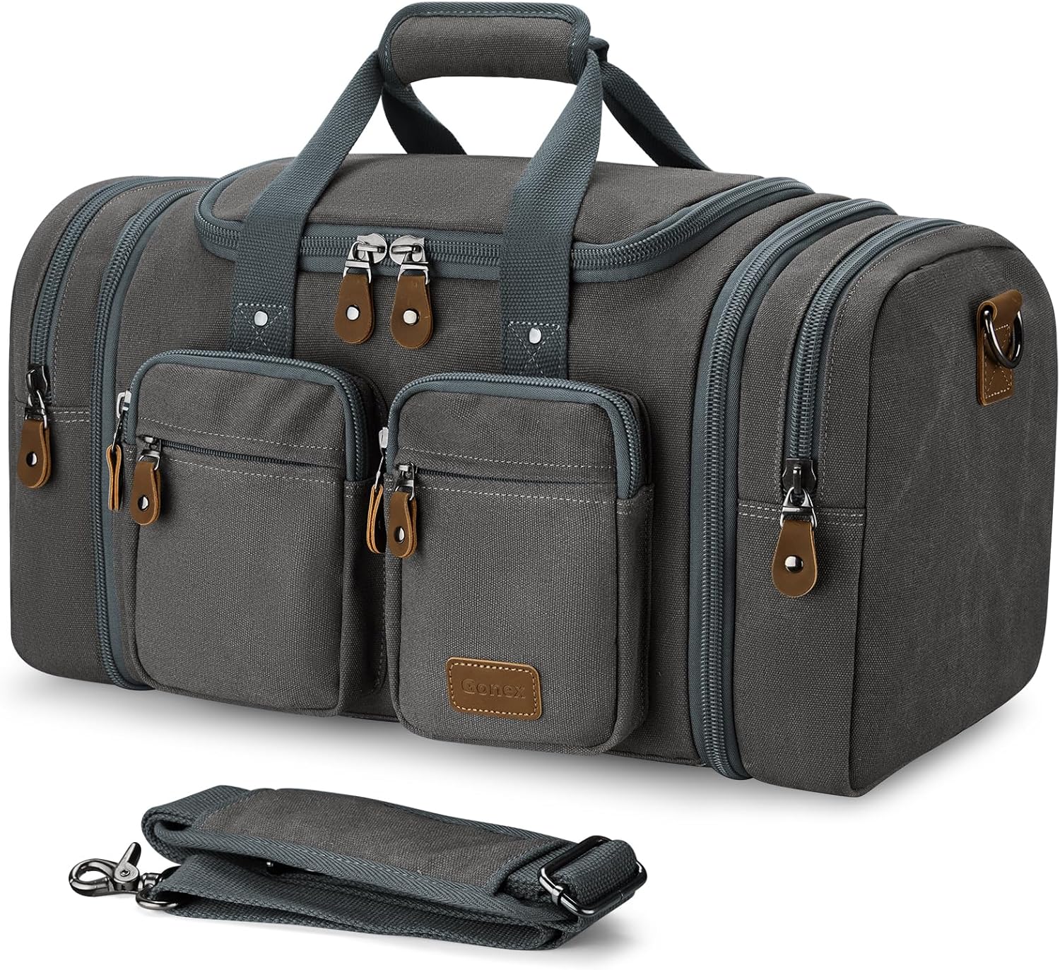 Gonex Canvas Duffle Bag for Travel, Expandable Water Resistant 50L Carry on Duffel Overnight Weekender Gym Bag with Wet Dry Separation Pocket & Suitcase Handle Sleeve, Grey