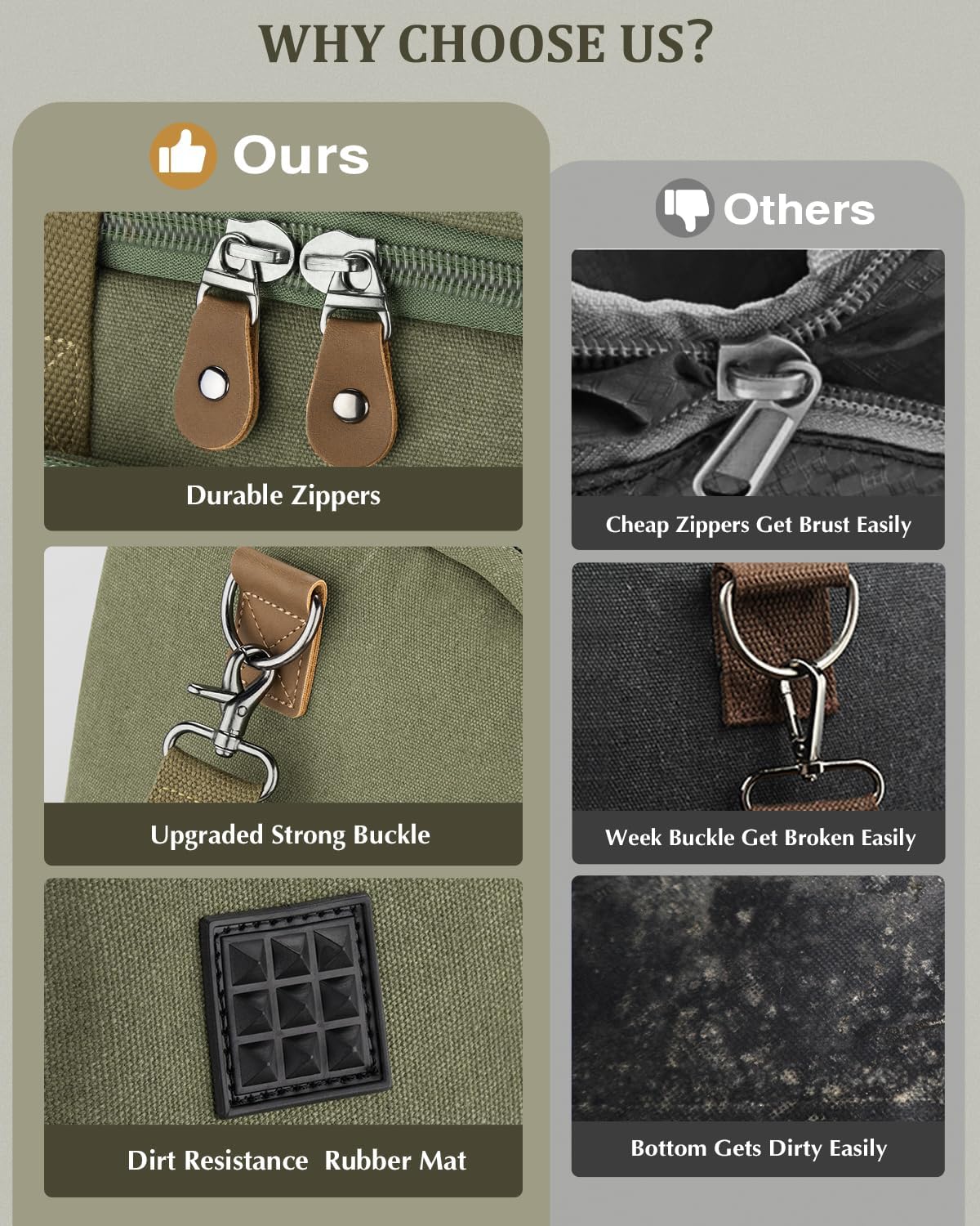 - Premium Materials: Crafted from water-resistant & tear-resistant canvas fabric, this overnight bag is built to withstand the rigors of daily use. Enhanced zippers provide durability for a seamlessly smooth user experience