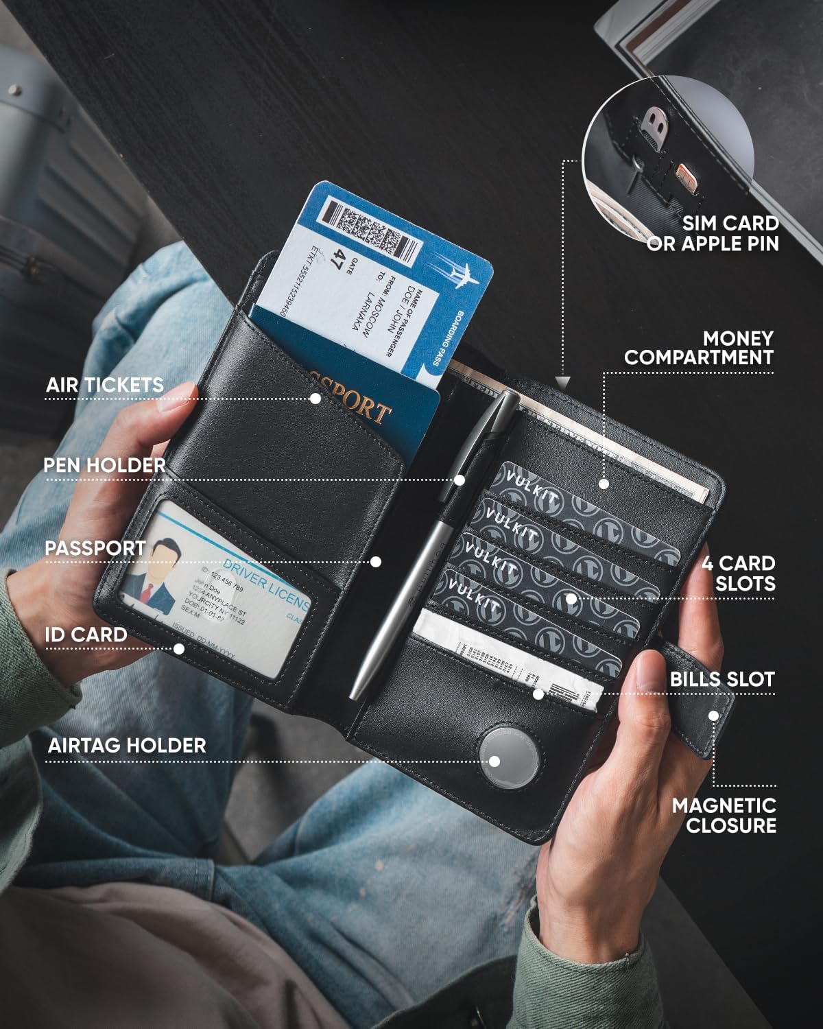 VULKIT Passport Holder with Airtag Holder RFID Blocking Passport Wallet Travel Leather Passport for Women(Iron Black)