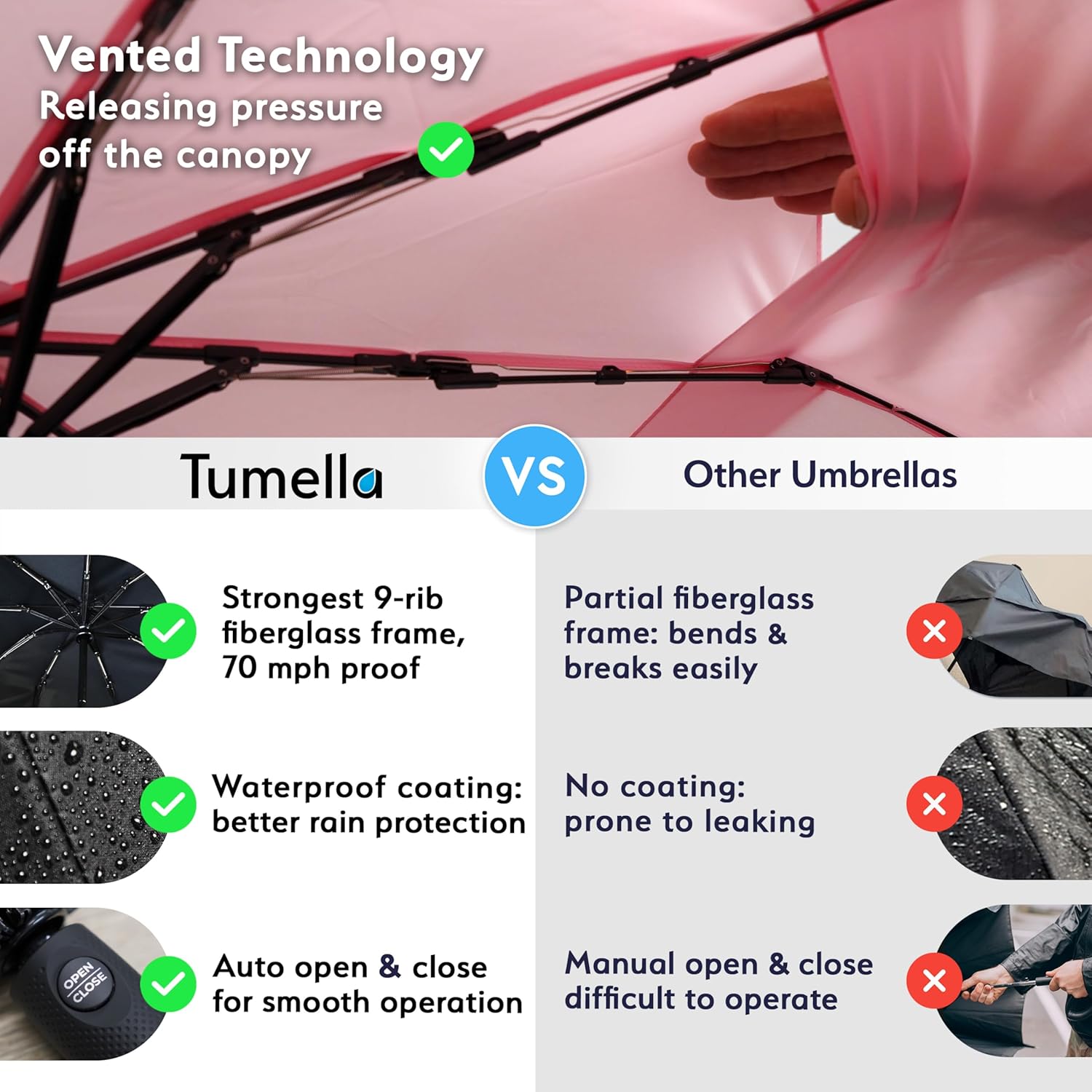 - SUPERIOR STURDINESS & LIFETIME REPLACEMENT: Unlike regular umbrellas with only 6 to 9 weak aluminum or resin-reinforced ribs, Tumella has 9 fiberglass ribs made specifically with the new and superior ultra-flex 2025 tech, making it almost unbreakable when it bends under heavy wind conditions (while retaining it’s shape and full functionality afterward). The last umbrella you'll need to buy.