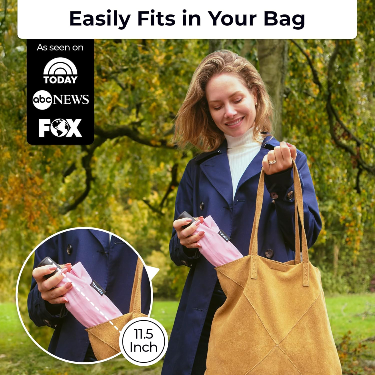 - LIGHTWEIGHT, EASY ONE-HANDED USE, SMALL & PORTABLE: Take this compact umbrella for travel with you wherever you go. So versatile and simple to use, with just the touch of a button, you can automatically open or close your Tumella. It fits perfectly in your backpack, purse, or car door, with just 11 by 2.75 inches in size, weights less than 1 lb, while offering a huge coverage of 42 inch.