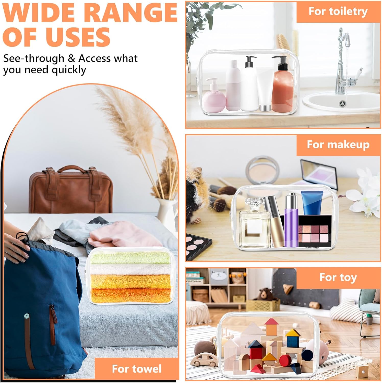 - 【TSA APPROVED】 The TSA certified clear toiletry bag strictly follow 3-1-1 airport regulations, so you don't have to worry about getting through airport security. All makeup bags are made of clear PVC material, so you can see the contents of the bag at a glance, and are BPA-free, safe and durable.