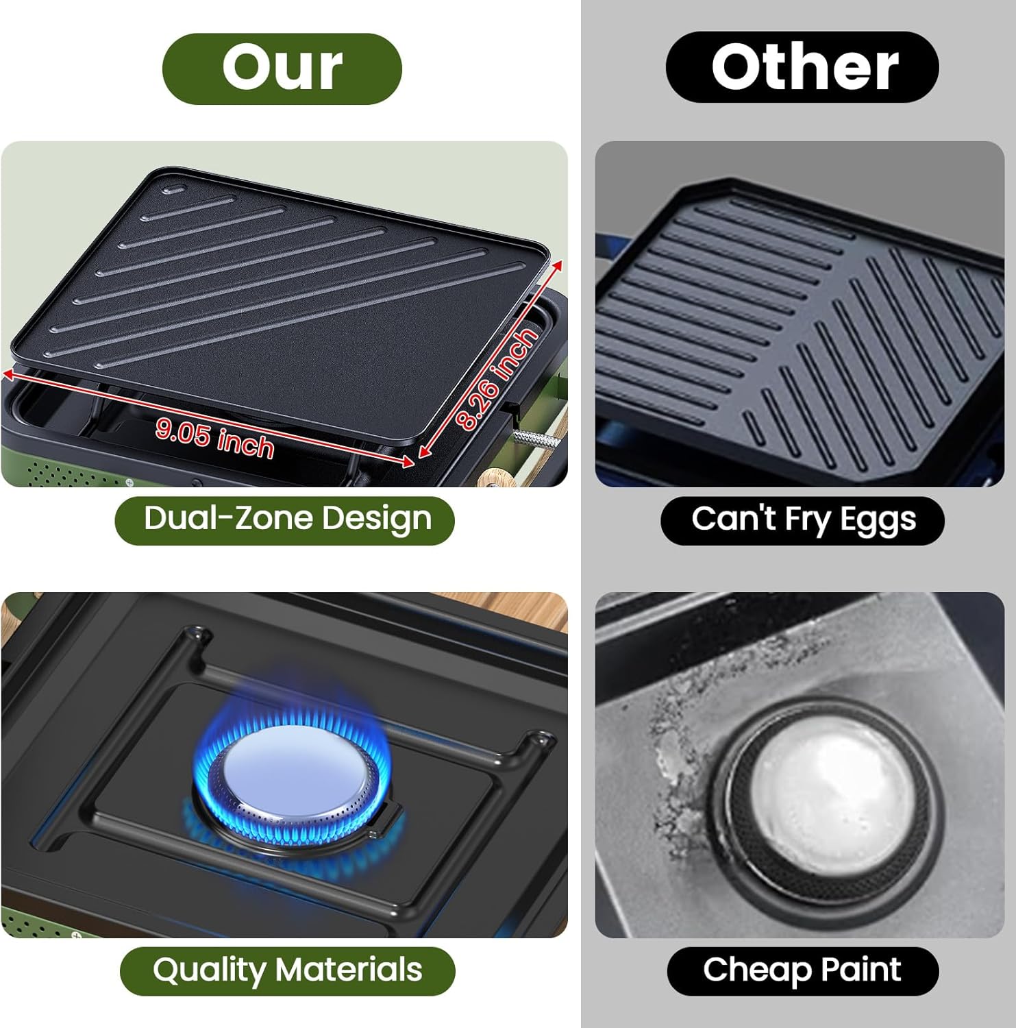 - Unique Dual-Function Griddles --- OGERY camping stove, a camping essentials must-have, features a one-of-a-kind griddle with two surfaces: a textured side for grilling steaks and hot dogs, and a smooth side for cooking eggs, cheese, and more. Enjoy versatility on all your outdoor adventures!