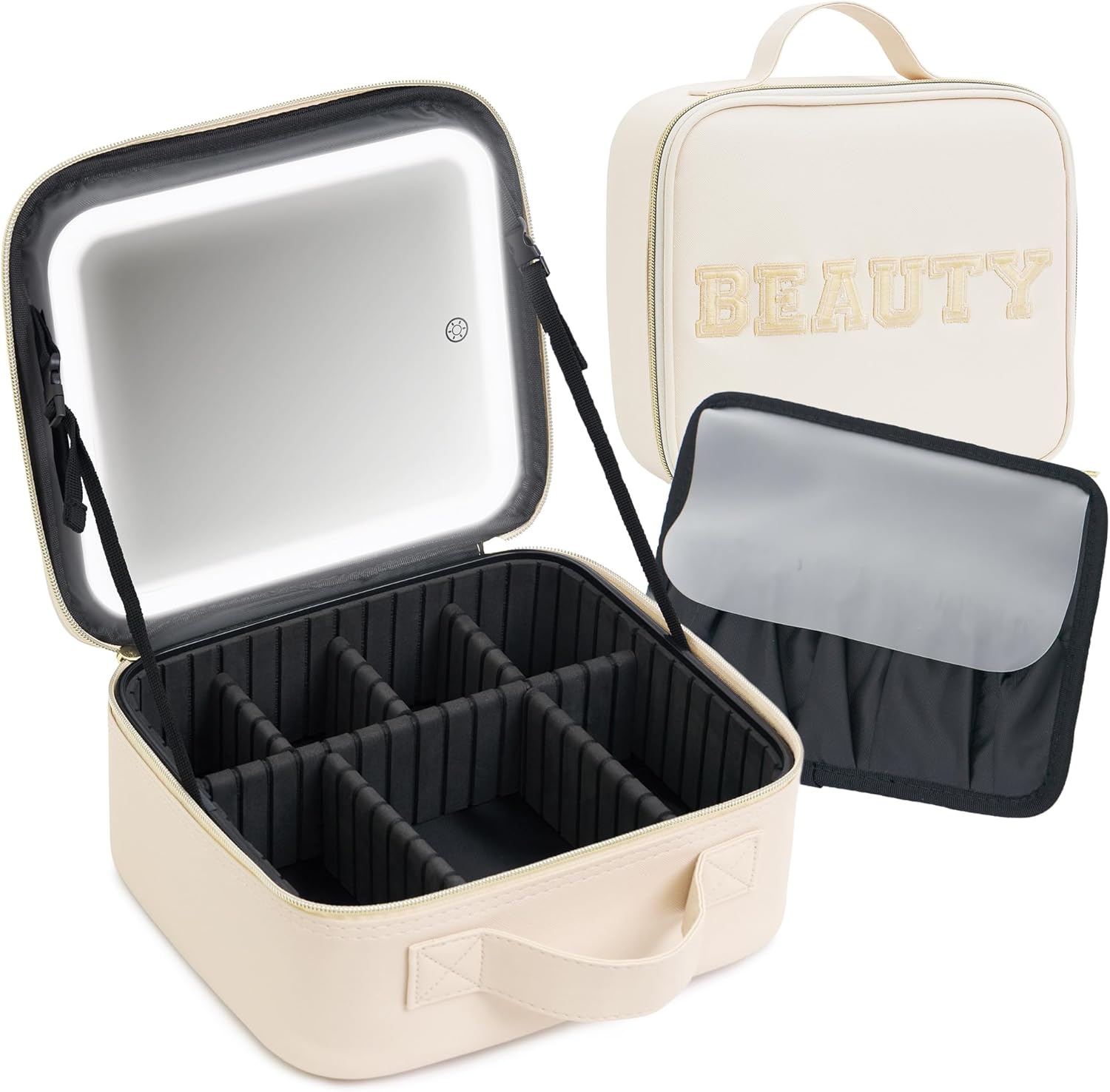 - DURABLE, TRAVEL-FRIENDLY & STYLISH: Designed for make up lovers on the move, this travel makeup bag is crafted from water-resistant PU leather for durability. Sturdy zippers and a trolley sleeve allow easy luggage attachment, making it ideal for vacations, business trips, or daily use. The lighted makeup case's compact size ensures convenience without compromising storage space.