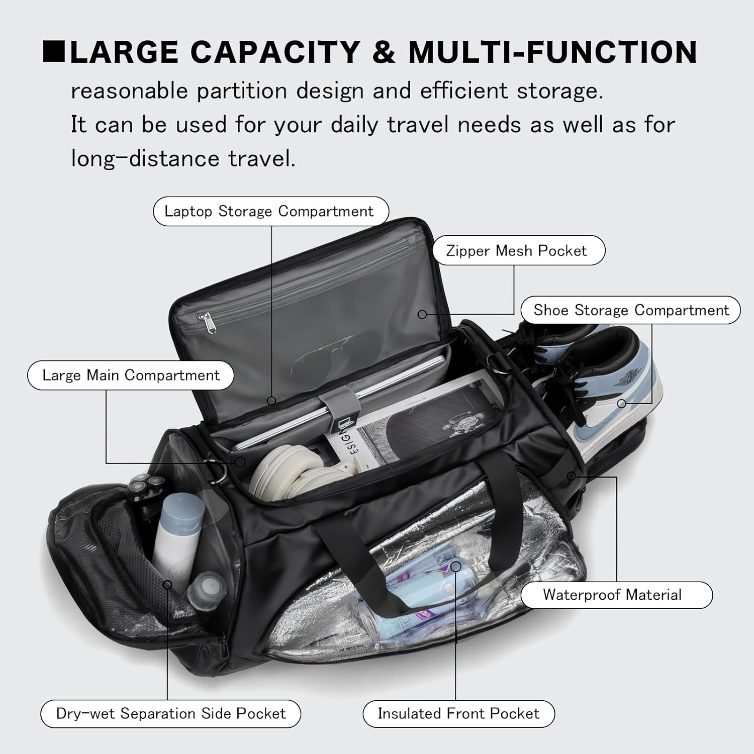 - Dry and Wet Separation,Independent Shoe Compartment:The gym bag for men is well thought out with a dry & wet compartment separation.The wet pocket with waterproof material ,saying goodbye to mixing wet and smelly items with clean items.The shoe compartment is separate from the main compartment pocket, providing ample space for your shoes and effectively isolating odors.
