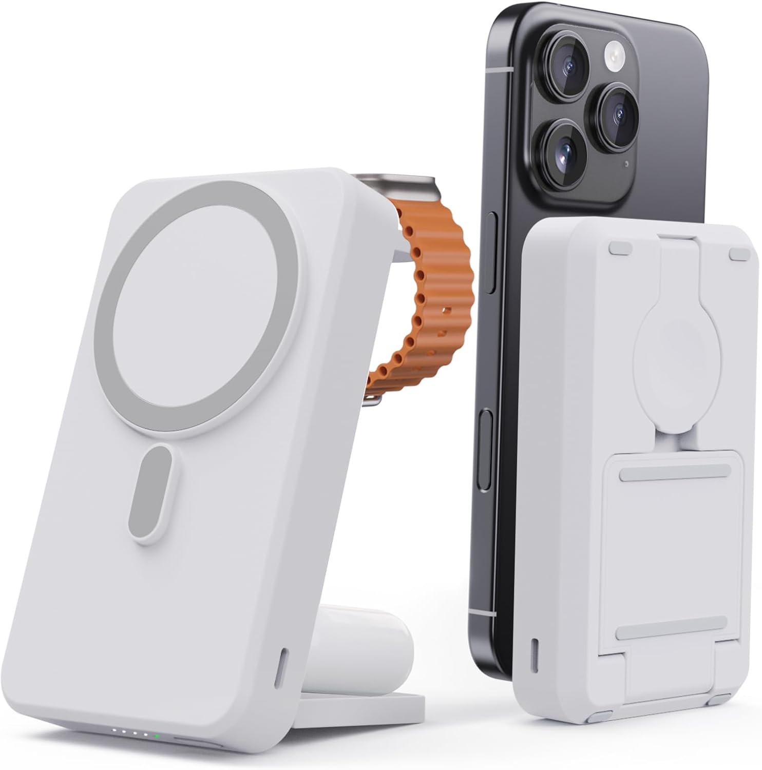 3-in-1 Portable Charger, 10000mAh Foldable Power Bank Fast Charging,MagSafe Charger Battery Pack Magnetic,Travel Wireless Charging Station for iPhone 16/15/14/13/12,iWatch, Air pods, White