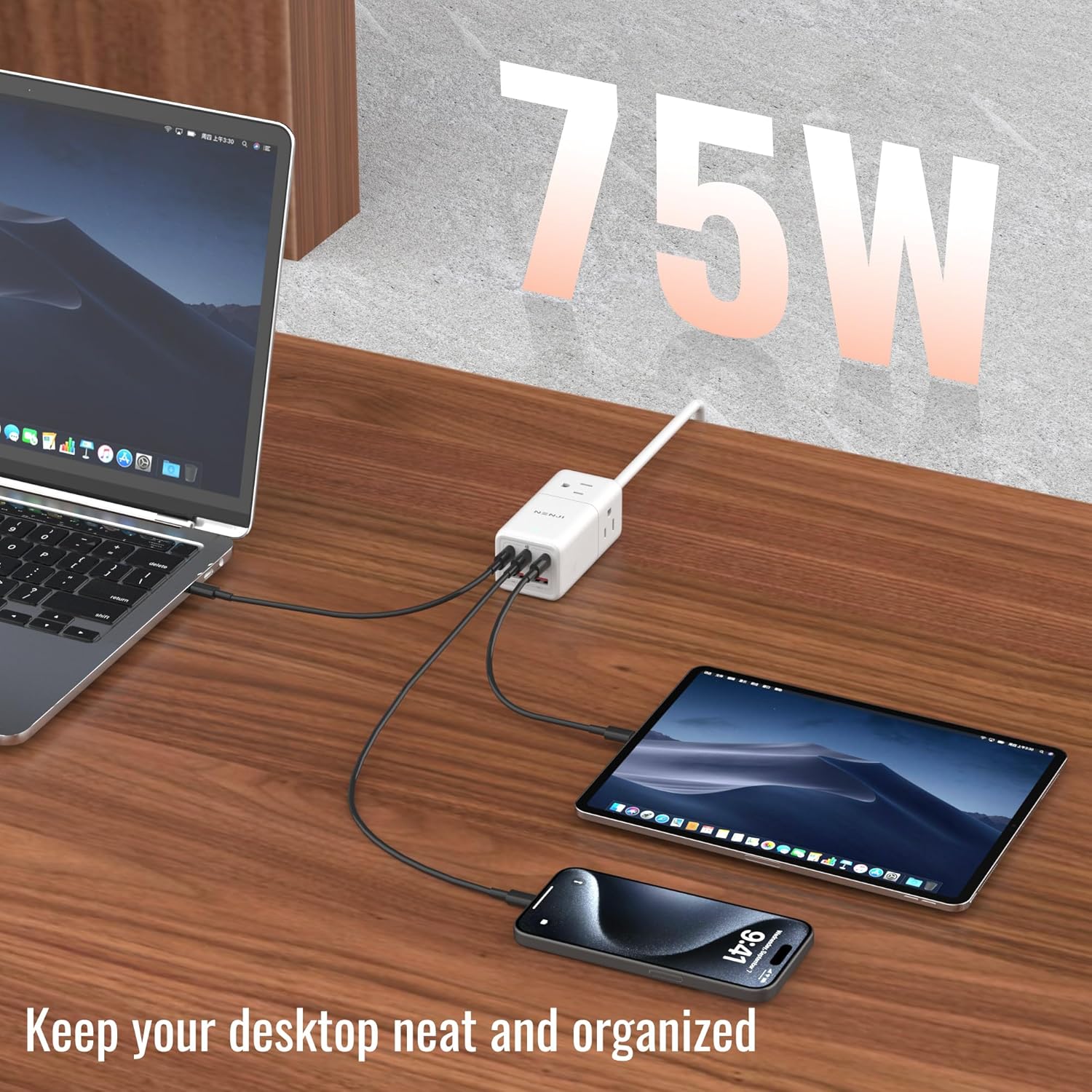 NENJI 75W GaN USB-C Super Fast Charging Station, 8-in-1 Power Strip with 5 USB & 3 AC Ports, Smart Charging, Fast PD Charger for iPhone, Samsung, iPad, MacBook – Desktop & Travel-Friendly – White