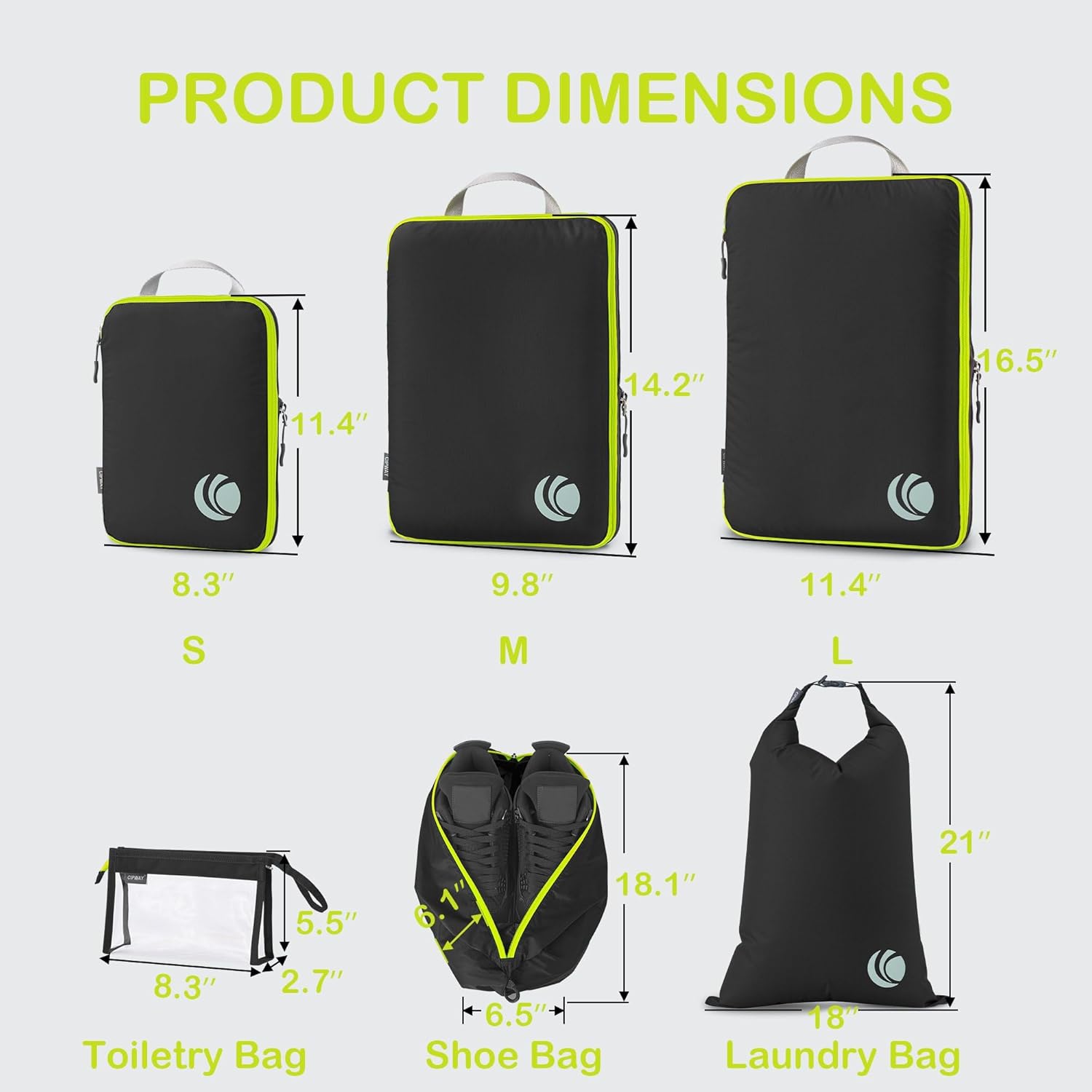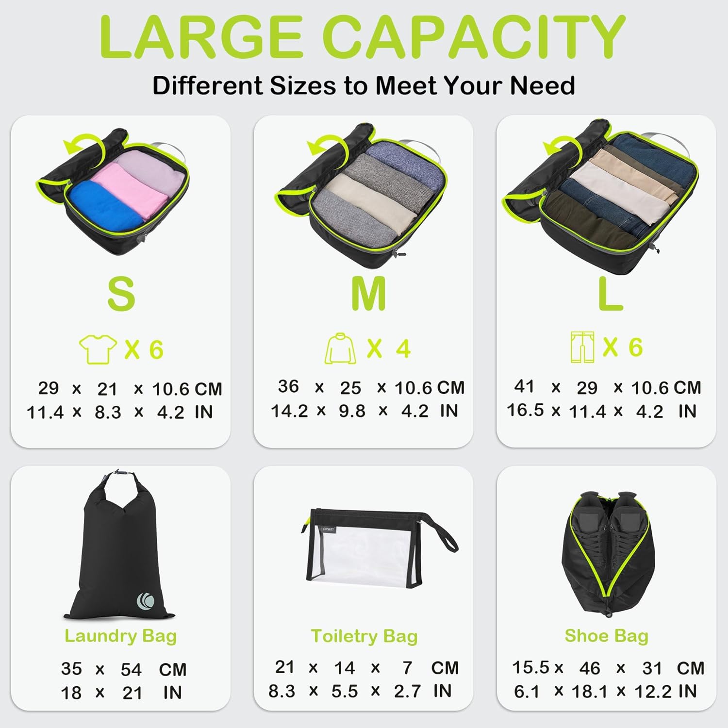 - Get Organized in Different Size: Our 8 set compression packing organizer comes with 2xSmall, 2xMedium, 1xLarge Packing Cubes, 1xShoe Bags, 1x Clear Toiletry Bags and Travel Laundry Bags, packing for anything from undergarments, tank tops to everyday wear and bulky items like off-season down jackets or blanket. Whether it’s for travel, household organization, or any other storage need