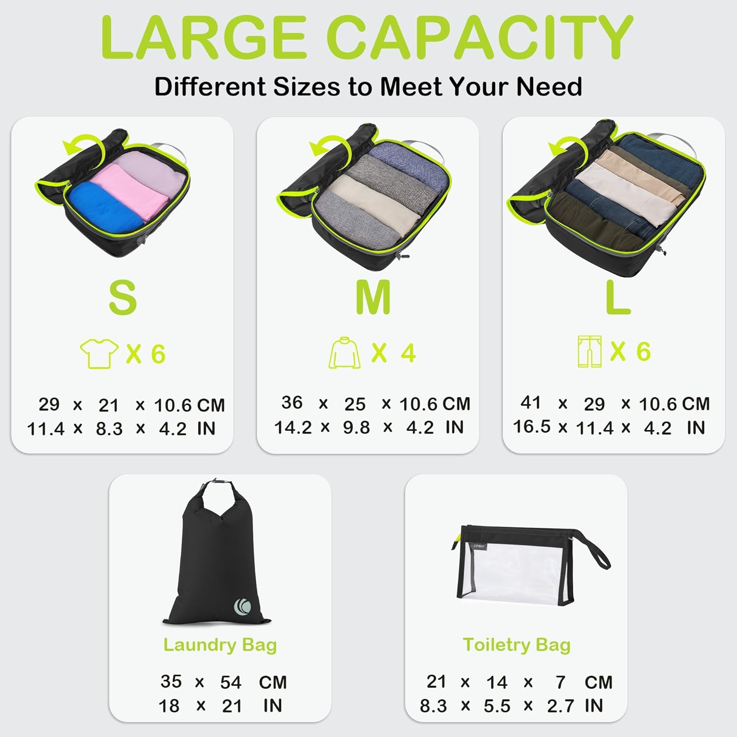 - Get Organized in Different Size: Our 6 set compression packing organizer comes with 1x Small, 2xMedium, 1xLarge Packing Cubes, 1x Clear Toiletry Bags and Travel Laundry Bags, packing for anything from undergarments, tank tops to everyday wear and bulky items like off-season down jackets or blanket. Whether it’s for travel, household organization, or any other storage need