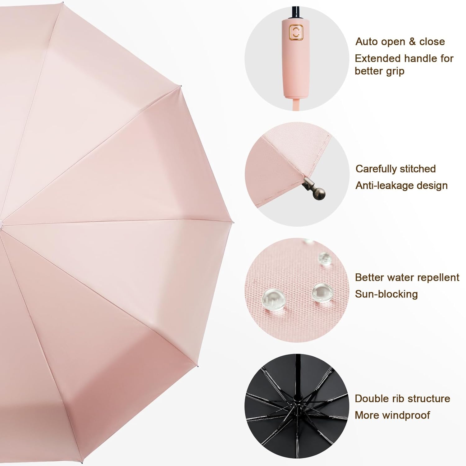 - Windproof ribs: We increased the number of ribs to 10, providing stronger support (windproof). The umbrella ribs adopt double rib structure, which is more windproof and durable