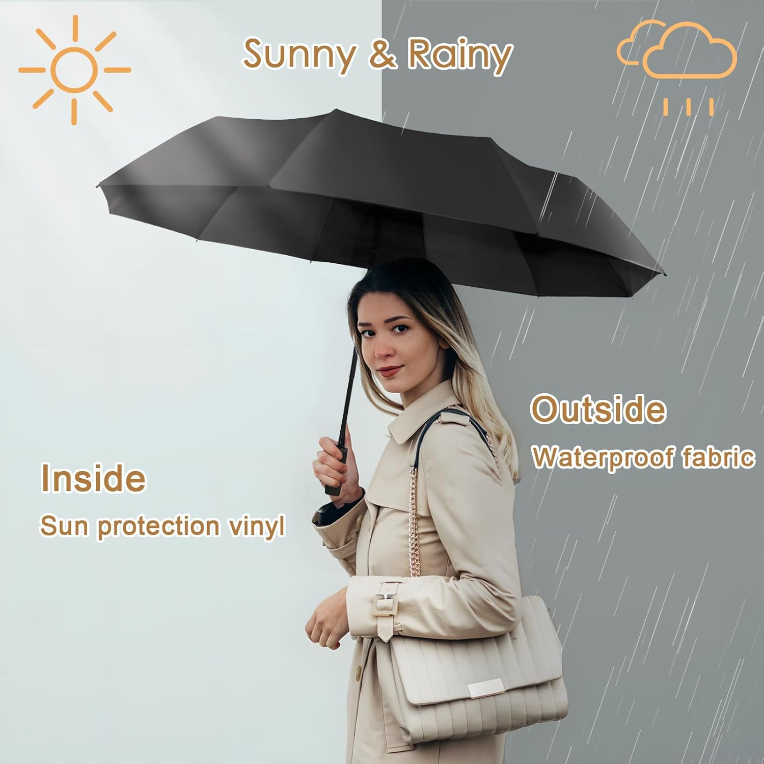 • Sun & Rain: For the umbrella canopy, we combine high-density pongee and vinyl for better waterproof and sun-blocking effects. It's a versatile umbrella that can be used on both sunny and rainy days.