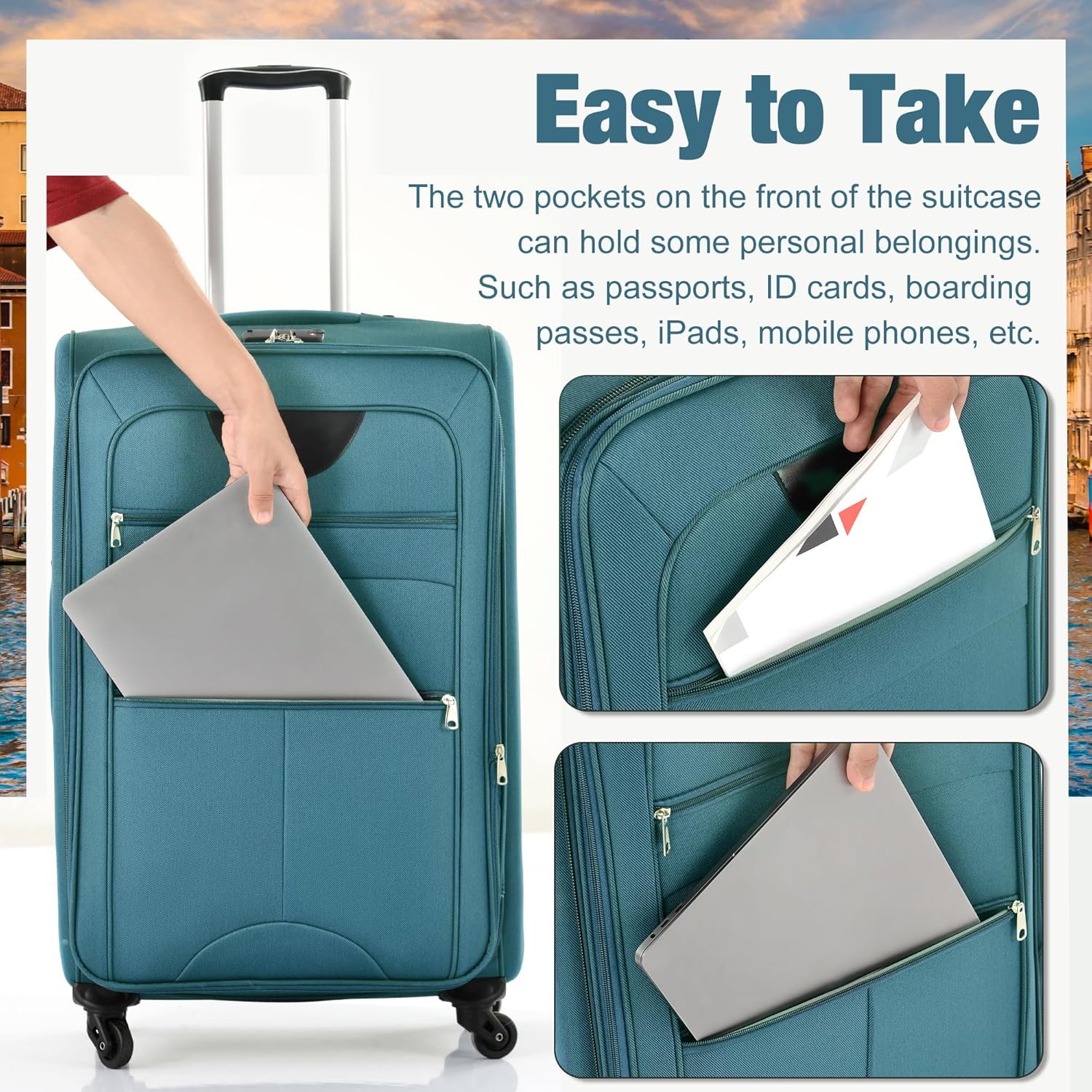 - [Easy Access Design]As a travel item, this set of luggage has a considerate design to offer more convenience to users, for instance, the design for easy access. External pockets with zippers can accommodate laptops or files/books to allow users could get them without unlocking the whole luggage.