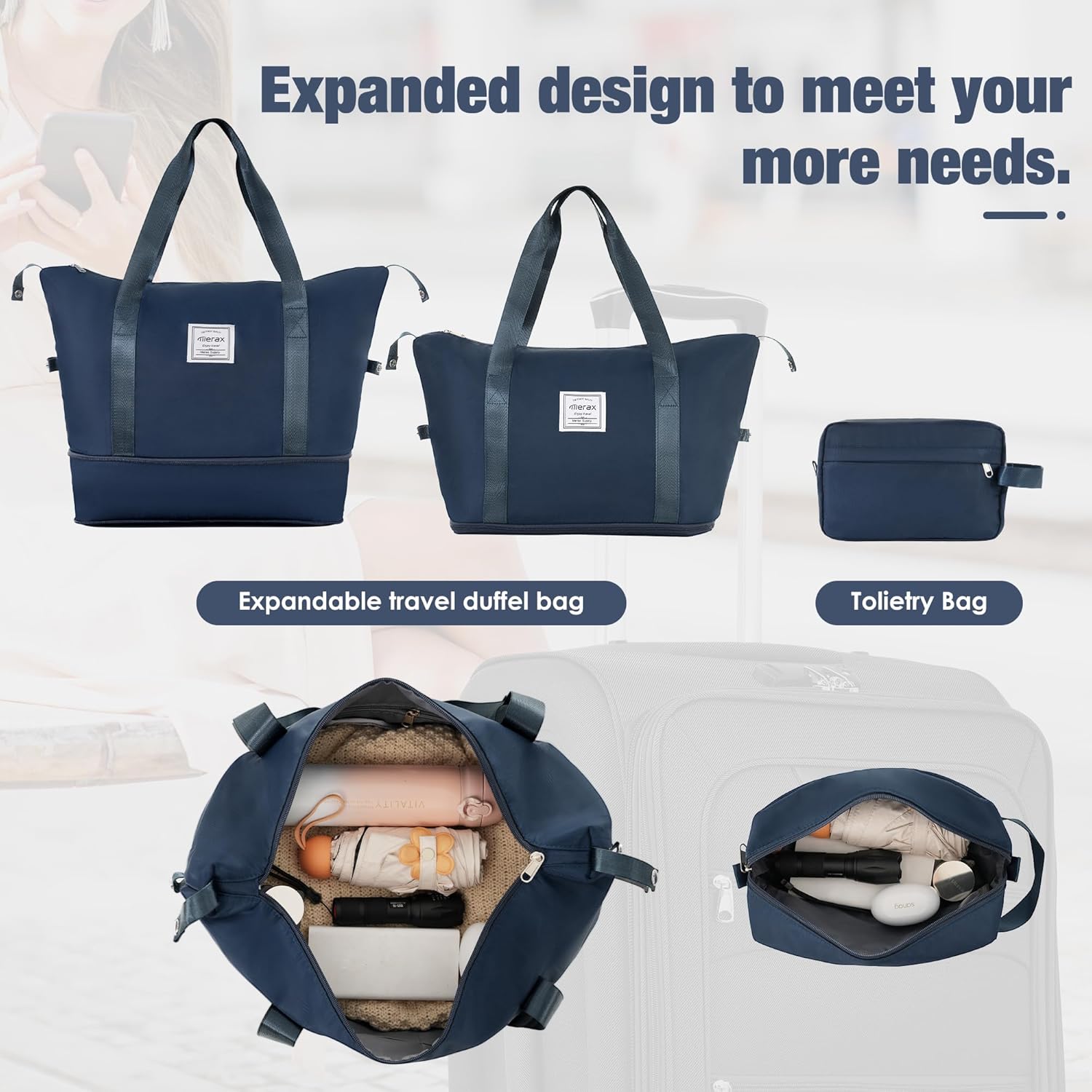 - [Include]Luggage set includes 3 luggages, a travel duffel bag, and a toiletry bag. The duffel bag has trolley sleeve with zippered pocket to pack your travel essentials, you can conveniently attach them to the adjustable suitcase handle to meet your needs.