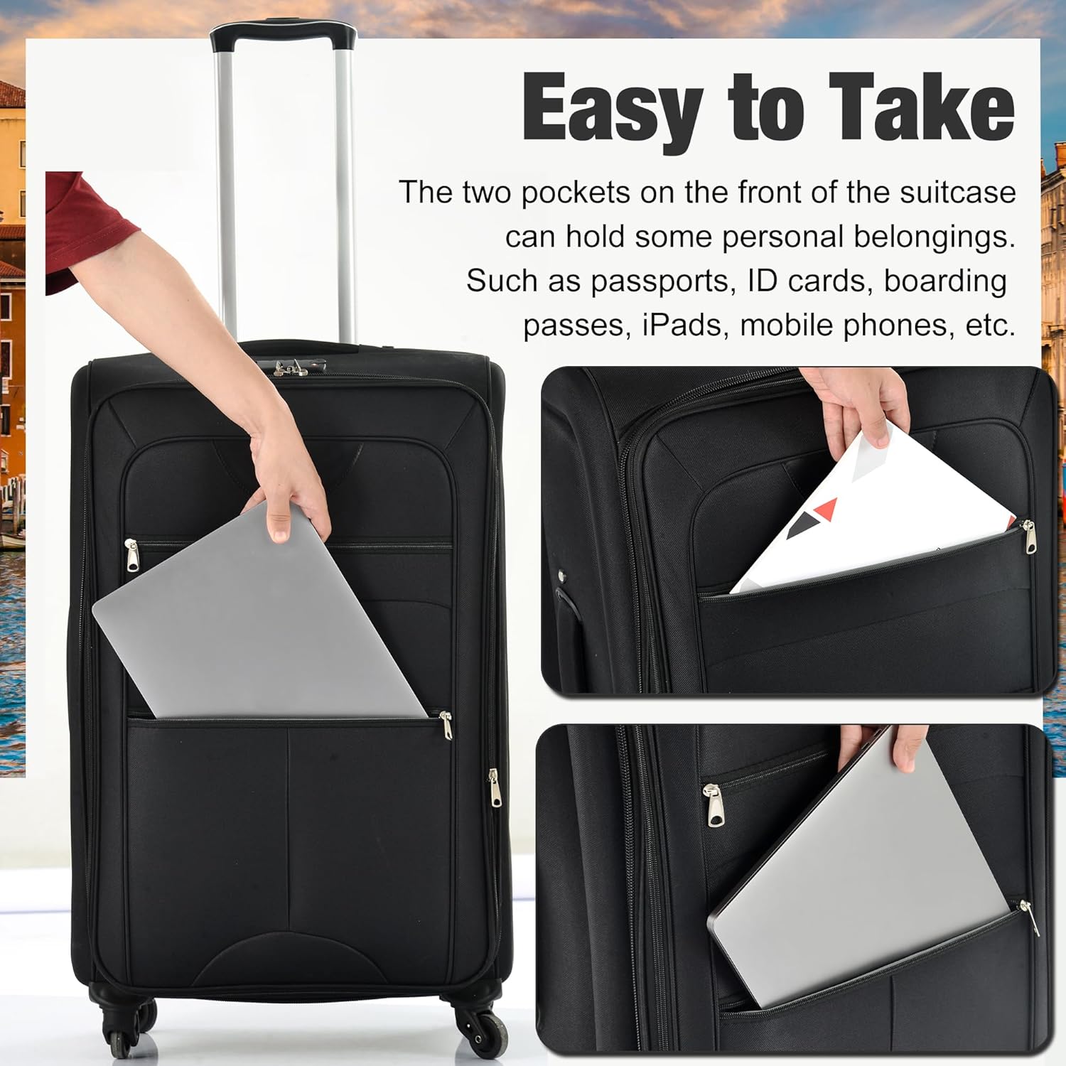 - [Easy Access Design]As a travel item, this set of luggage has a considerate design to offer more convenience to users, for instance, the design for easy access. External pockets with zippers can accommodate laptops or files/books to allow users could get them without unlocking the whole luggage.