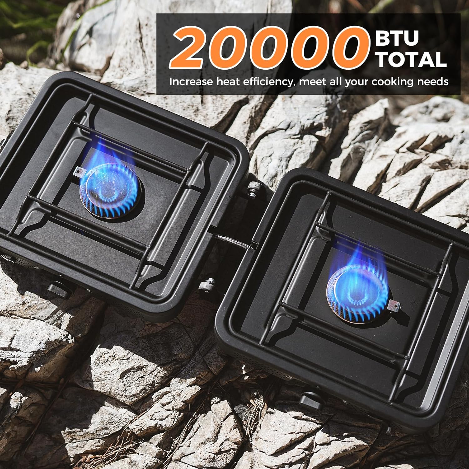 - 20000 BTU High Power Burners: Thanks to its well designed spacing, it can comfortably fit two 10-12inch frying pans, this camping stove features 2 high-powered sealed burners with 20000 total BUTs of cooking power