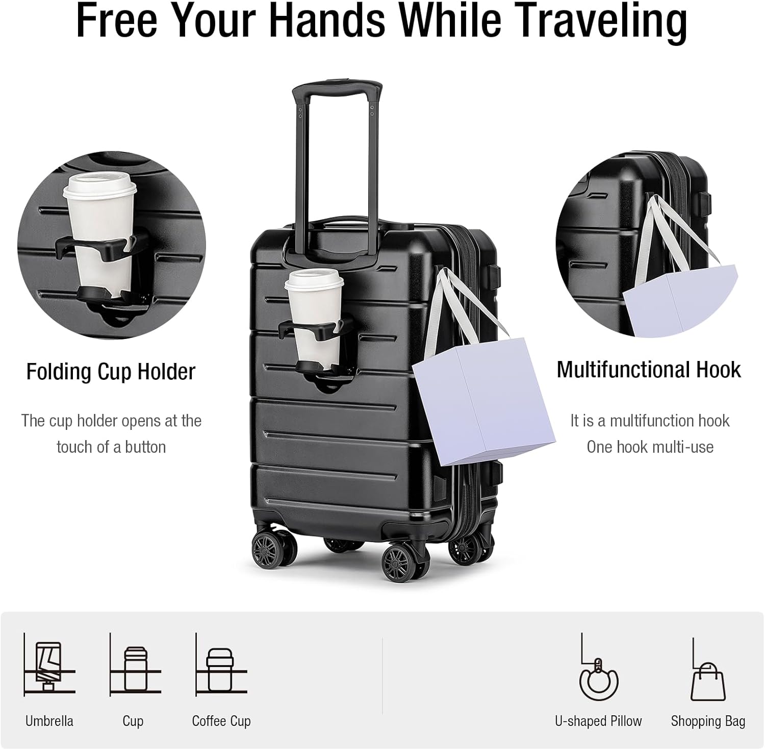 KYME Carry On Luggage 22x14x9 Airline Approved Expandable with Cup Holder 20 Inch Hardshell Carry-On Suitcase with Spinner Wheels TSA Lock Small Lightweight Travel Rolling Luggage Black