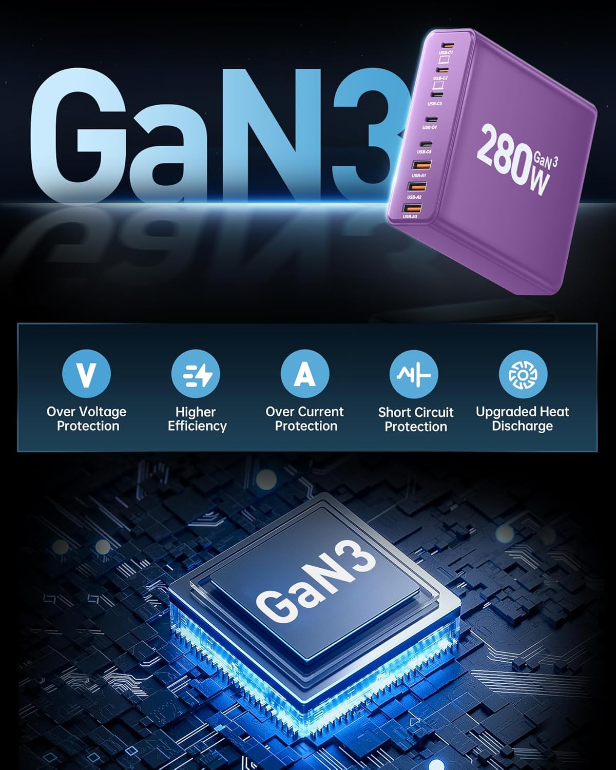 280W USB C Charger Block, 8-Port USB C Charging Station GaN III PD 65W Laptop Charger Adapter Compatible with MacBookPro/Air,DELL,iPad,Portable Charging Station for iPhone,Samsung Galaxy(Purple)